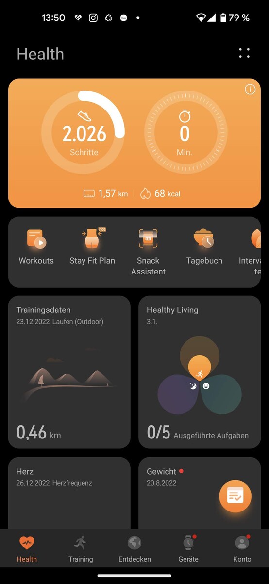 In het gedeelte Gezondheid geeft de app een overzicht van de verzamelde gegevens op het gebied van hartmeting, slaap, stress, SpO2, bloeddruk, gezond leven en trainingsgegevens. Gemaakte stappen, trainingstijd, afgelegde afstanden en verbrande calorieën worden centraal weergegeven. Door op de betreffende tegel te drukken wordt een submenu geopend. De inhoud en de volgorde van de tegels kunnen worden aangepast.