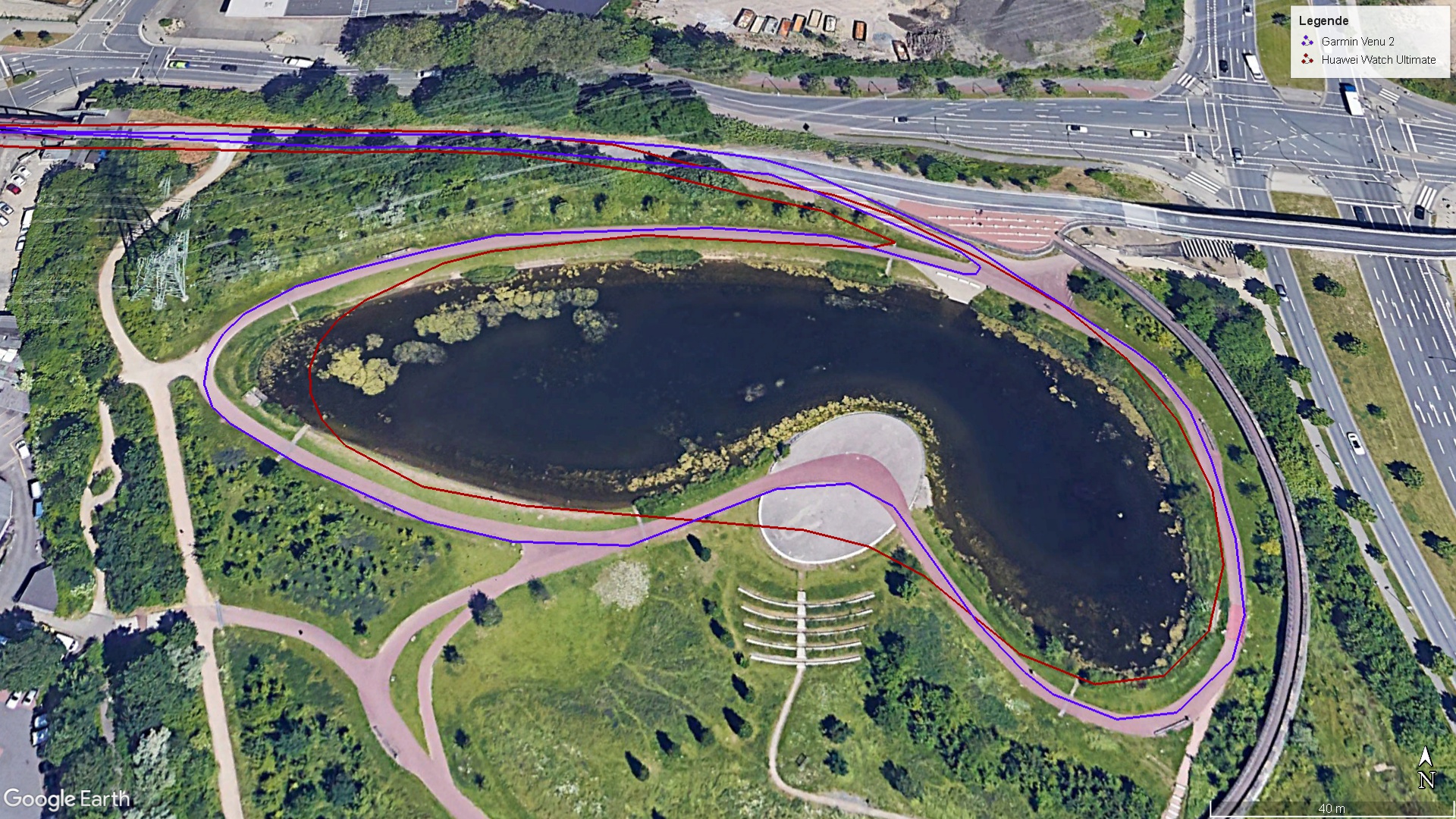Om de satellietverbinding te meten, namen we de Watch Ultimate mee op een fietstocht, samen met een referentietoestel, de Garmin Venu 2. De resultaten waren verrassend, want hoewel de Watch Ultimate bedreven is in het bereiken van een dubbele GNSS-verbinding met alle gangbare satellietnetwerken, is de registratie erg onnauwkeurig. De richting wordt herkend, maar de weergegeven radii komen nauwelijks overeen met de routes.