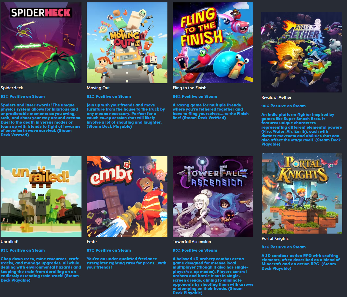 - Towerfall Ascension - een lokaal partyspel voor maximaal 4 spelers dat meerdere prijzen heeft gewonnen. Het is $14,99 waard, heeft het label Steam Deck Playable en is uitgebracht in 2014.