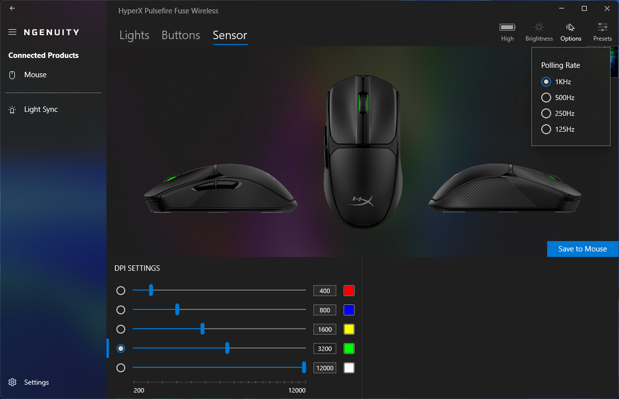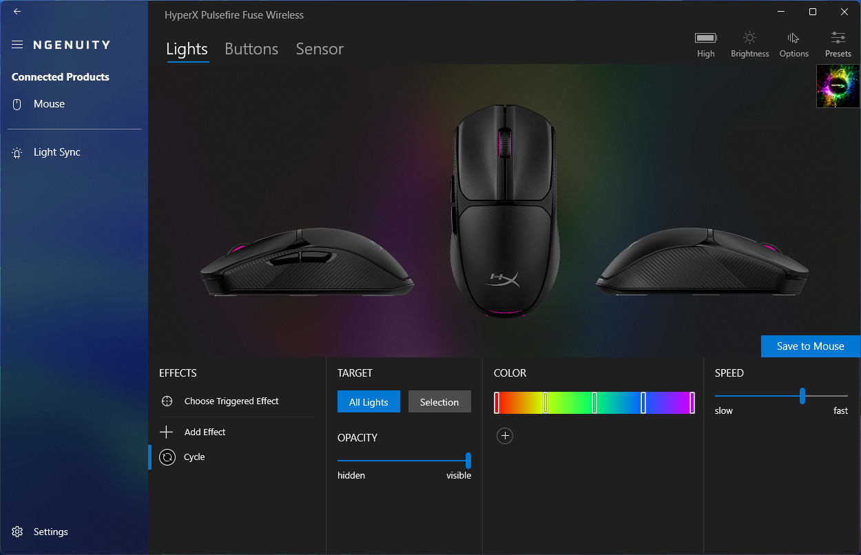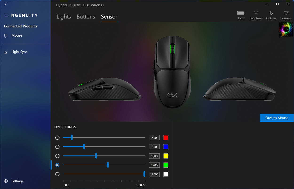 De Pulsefire Fuse Wireless werkt out of the box zonder dat er extra software nodig is. Voor degenen die meer controle willen, biedt de HyperX Ngenuity app biedt RGB-aanpassingen en HyperX-apparaatsynchronisatie, knopremapping, aanpassingen van de pollingsnelheid, maximaal vijf aangepaste DPI-modi en een onboard presetopslag.