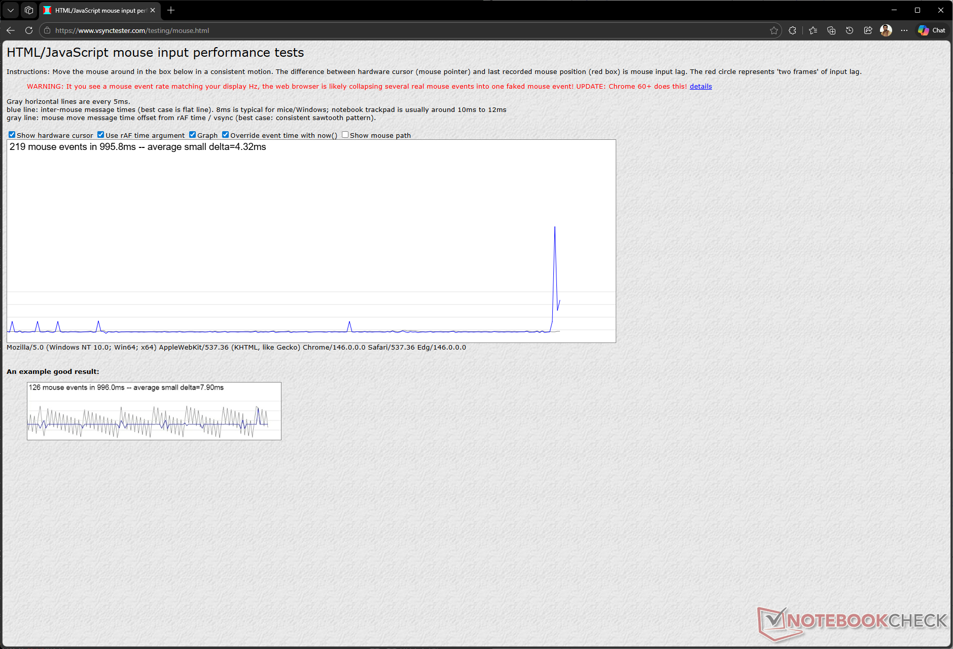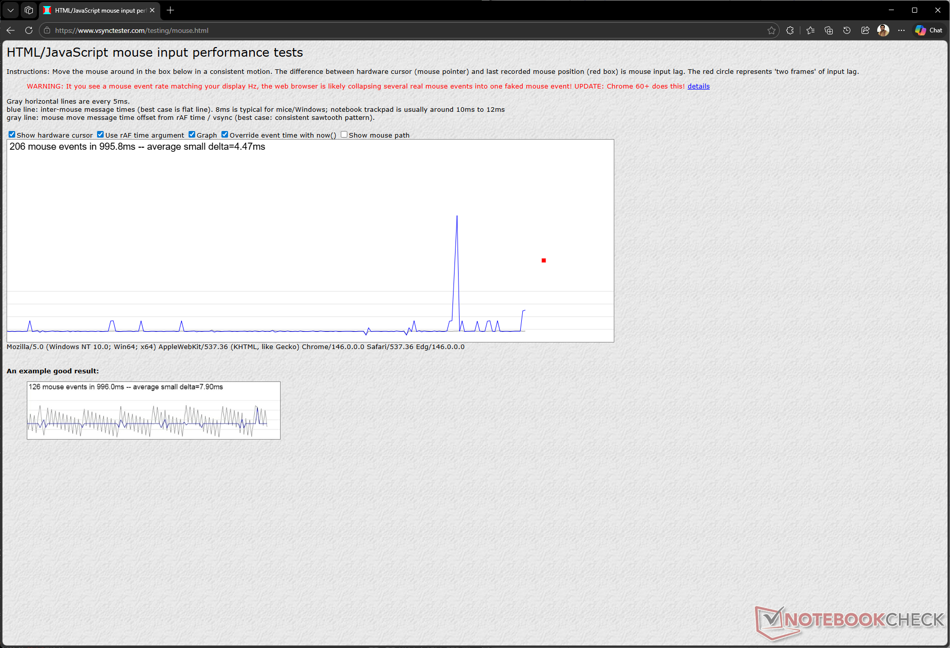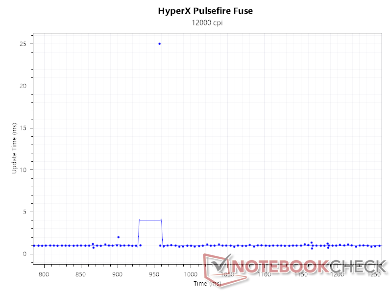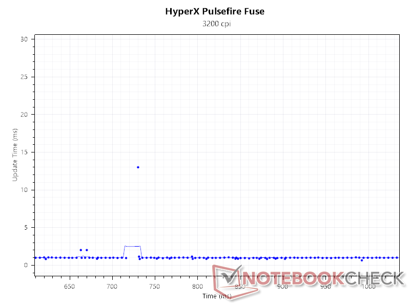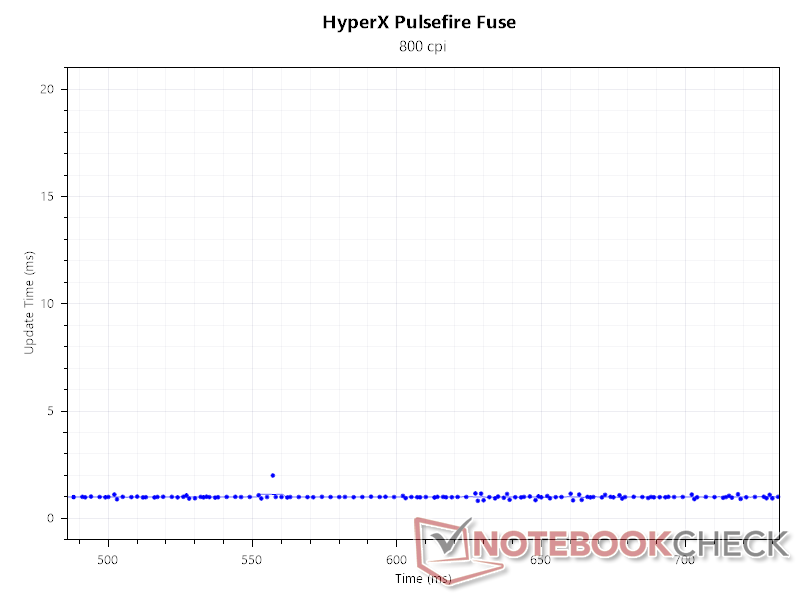 In overeenstemming met de bovenstaande grafieken voor de pollingsnelheid vinden we dat het update-interval consistent 1 ms is bij 1000 Hz en 800 DPI.