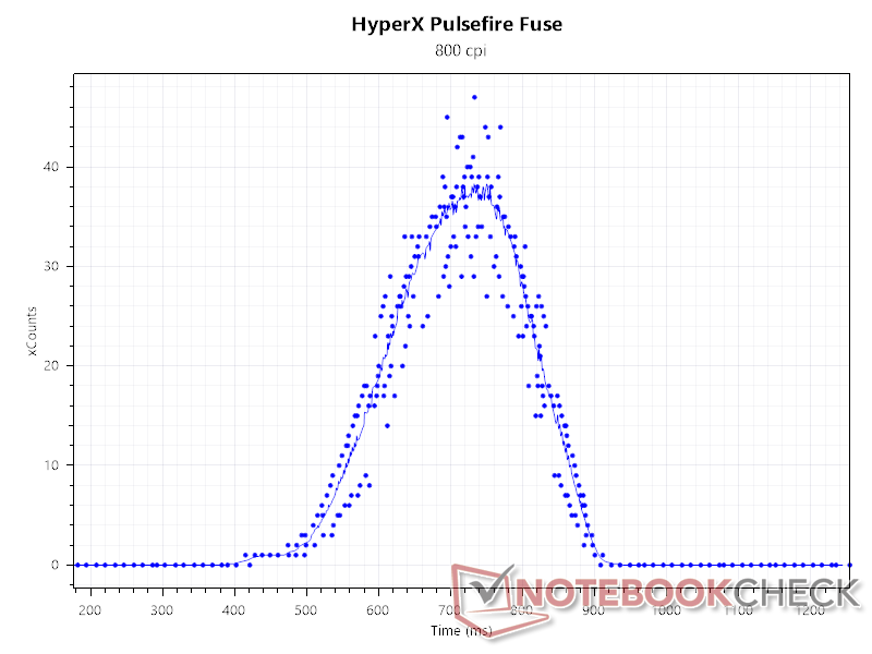Bij een peilsnelheid van 1 kHz en 800 DPI vinden we dat de PAW3311 van Fuse Wireless een goed aantal tellingen dicht bij de centrale curve volgt.