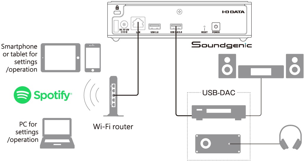 De Soundgenics kan verbinding maken met draadloze thuisrouters met behulp van 1000/100/10 Ethernetkabels, waardoor muziek kan worden gestreamd naar audiosystemen thuis, DAP's en draagbare apparaten. De NAS heeft ook een USB 3.1 en een USB 2.0 poort voor het aansluiten van een extern Blu-ray/DVD/CD-station voor het rippen van muziek. Een USB-naar-stereo-RCA kabel kan ook worden gebruikt om de Soundgenic aan te sluiten op analoge audiosystemen en luidsprekers thuis.