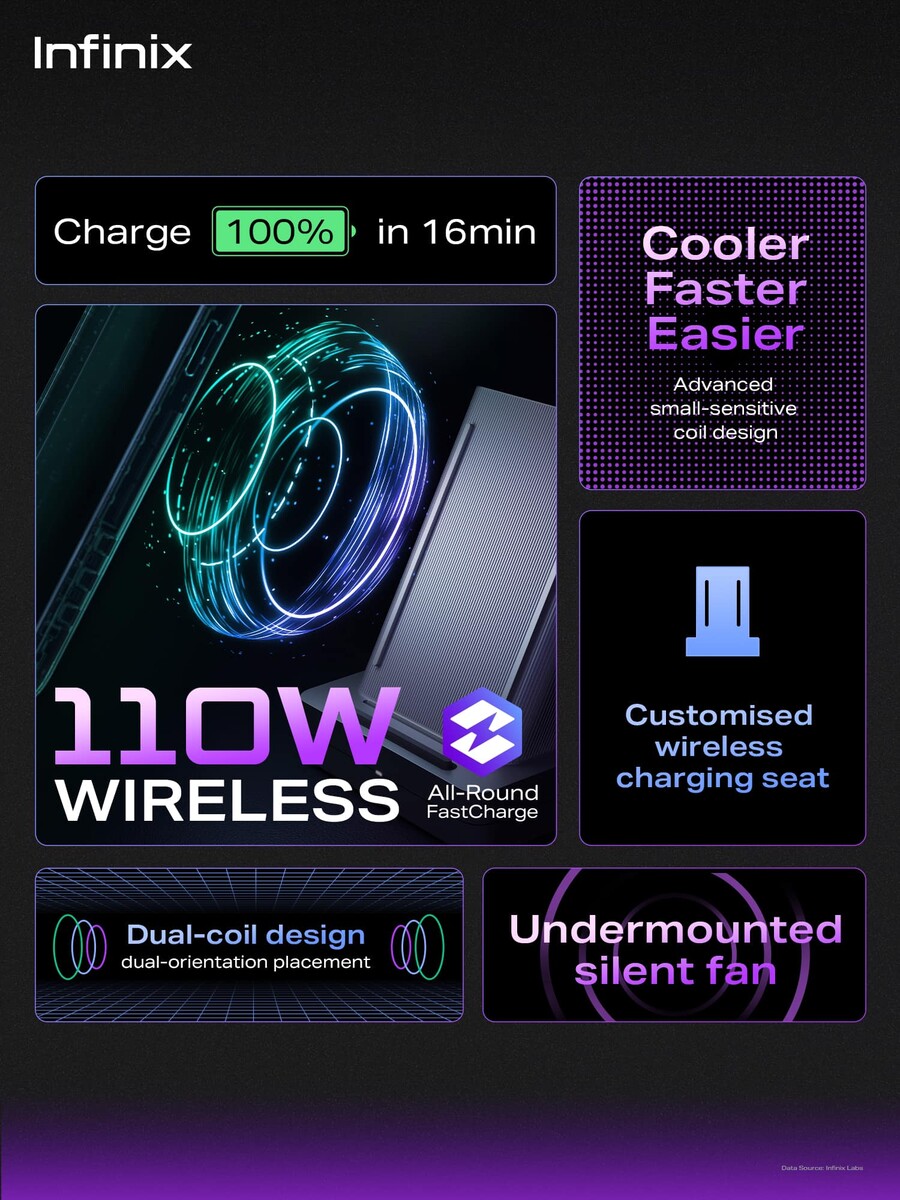 Bij de lader zijn extra beschermingsmechanismen inbegrepen, zodat batterijen gedurende langere tijd energie kunnen blijven opslaan. Infinix claimt dat batterijen zo 90% van hun oorspronkelijke energieopslagcapaciteit kunnen behouden, zelfs na 1000 laadcycli. In de lader zijn maar liefst 140 beschermingsmechanismen en 20 temperatuursensoren geïntegreerd. De draadloze basis kan horizontaal of verticaal worden gebruikt en wordt geleverd met een ventilator om de achterkant van het oplaadapparaat koel te houden.