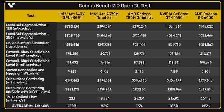 Er zullen twee configuraties zijn voor de Intel Core Ultra 200V serie. De duurdere optie is de Arc 140V, die 8 Xe2-kernen zal hebben. Deze Lunar Lake iGPU is zojuist geslaagd voor de OpenCL tests op CompuBenchen hij scoort hoger dan de AMD Radeon 780M en komt dicht in de buurt van de GTX 1650. VideoCardz heeft een gedetailleerde vergelijkingstabel gemaakt, die u aan het einde kunt bekijken.