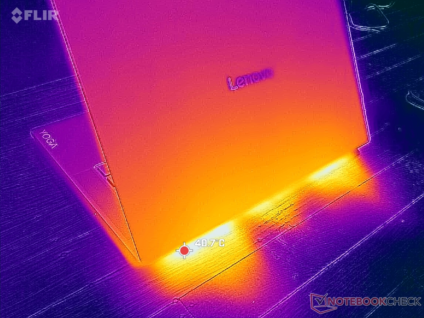 De ontwikkeling van de oppervlaktetemperatuur is symmetrisch met hete plekken in het midden achteraan de behuizing. Deze gebieden kunnen een temperatuur van 41 C bereiken tijdens het gamen of meer dan 46 C wanneer de CPU langere tijd volledig wordt gebruikt. De resultaten verschillen niet significant van de Snapdragon-aangedreven Asus VivoBook S 15, maar zijn gemiddeld koeler dan de kleinere en krachtigere XPS 14.