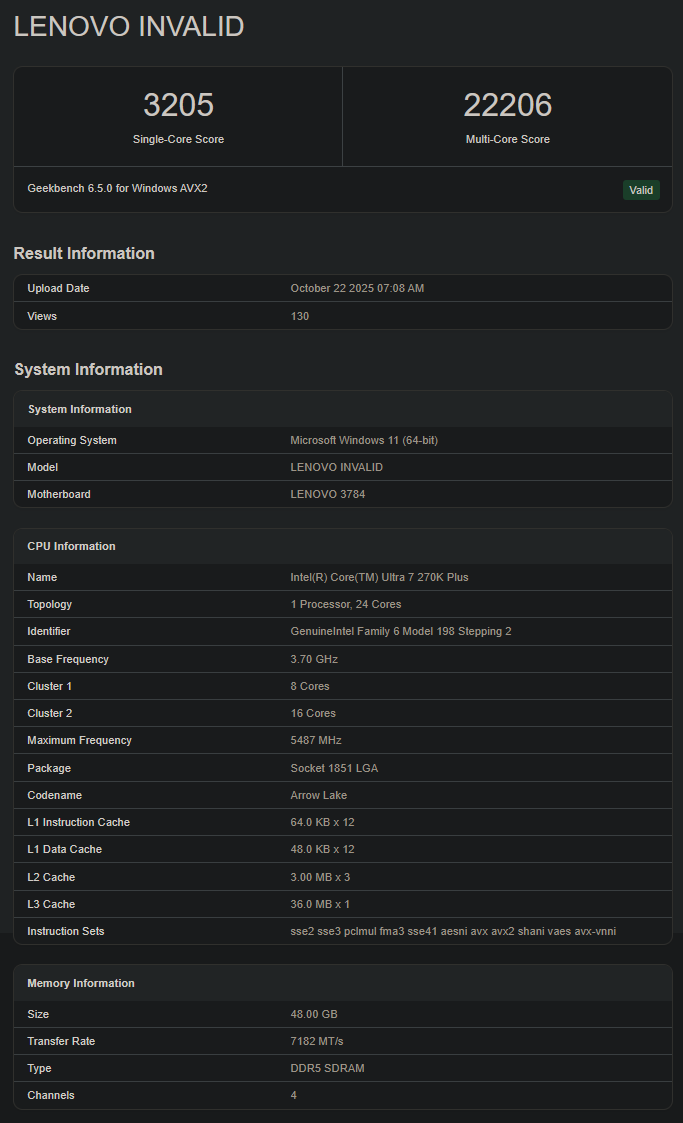 Hij scoort respectievelijk 3.205 en 22.206 in Geekbench 6.5's single en multi-core tests. De Core Ultra 7 270K Plus heeft 24 kernen (8 P + 16 E), 24 threads en een boostklok van 5,4 GHz. Hij drijft een niet nader gespecificeerde Lenovo PC aan met 48 GB DDR5-7182 (DDR5-7200) RAM waarop Windows 11 draait. De back-end van Geekbench laat zien dat hij getest is naast een GeForce RTX 5090 D, een GPU die alleen in China gebruikt wordt.