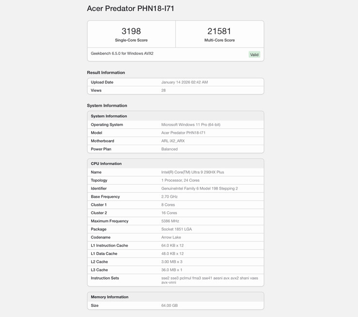 Met een Geekbench 6 single-threaded score van 3.198 punten en een multi-core score van 21.581 punten is de Core Ultra 9 290HX Plus al respectievelijk 5,6% en 4,6% sneller dan de Core Ultra 9 285HX in deze benchmarkrun. Een enorme prestatiesprong is dus niet te verwachten, wat niet verwonderlijk is aangezien de nieuwe processors gebaseerd zijn op dezelfde architectuur als de oudere Arrow Lake chips