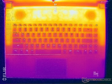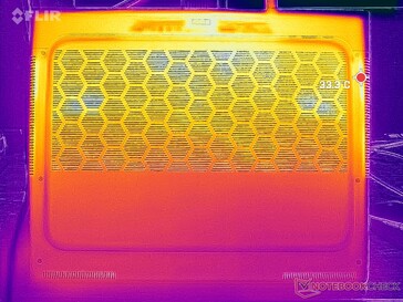 De oppervlaktetemperaturen kunnen erg hoog oplopen door het dunne profiel. Hete plekken kunnen oplopen tot ongeveer 50 C aan de boven- en onderkant, vergeleken met slechts 40 C op de Blade 16. Gelukkig bevinden deze hete plekken zich aan de achterkant en weg van de palmsteunen. Gelukkig bevinden deze warme plekken zich aan de achterkant en uit de buurt van de palmsteunen.