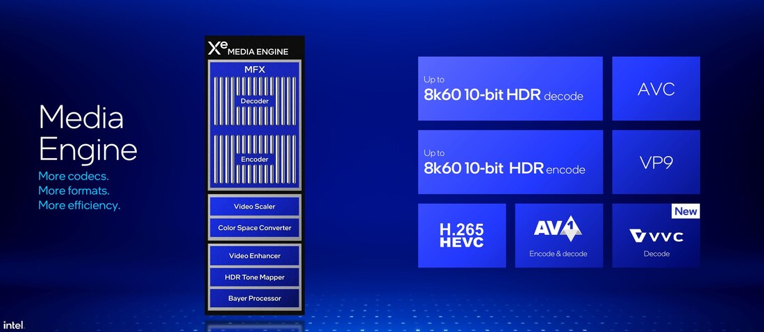 Nu de VVC-codec wordt ondersteund door de nieuwe media-engine, kan deze een 8K HDR-video bij 60 Hz (of 3x 4K HDR @ 60 Hz) uitvoeren via DisplayPort 2.1 of HDMI 2.1. De kloksnelheden van de nieuwe iGPU's variëren van 1,85 GHz (op de Arc Graphics 130V) tot maximaal 2,05 GHz met de Arc Graphics 140V in de Core Ultra 9 288V. Voor onze test gebruikten we de Core Ultra 7 258V, waarbij de Arc Graphics 140V een maximale kloksnelheid van 1,95 GHz bereikte.