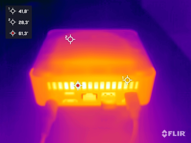 In de ruststand warmt de behuizing van de Intel NUC 13 Desk Edition Kit slechts licht op. De geïnstalleerde koeler zuigt lucht aan via de zijkanten en leidt het naar de achterkant van het apparaat, waarbij de componenten zoals het RAM en de SSD gekoeld worden.