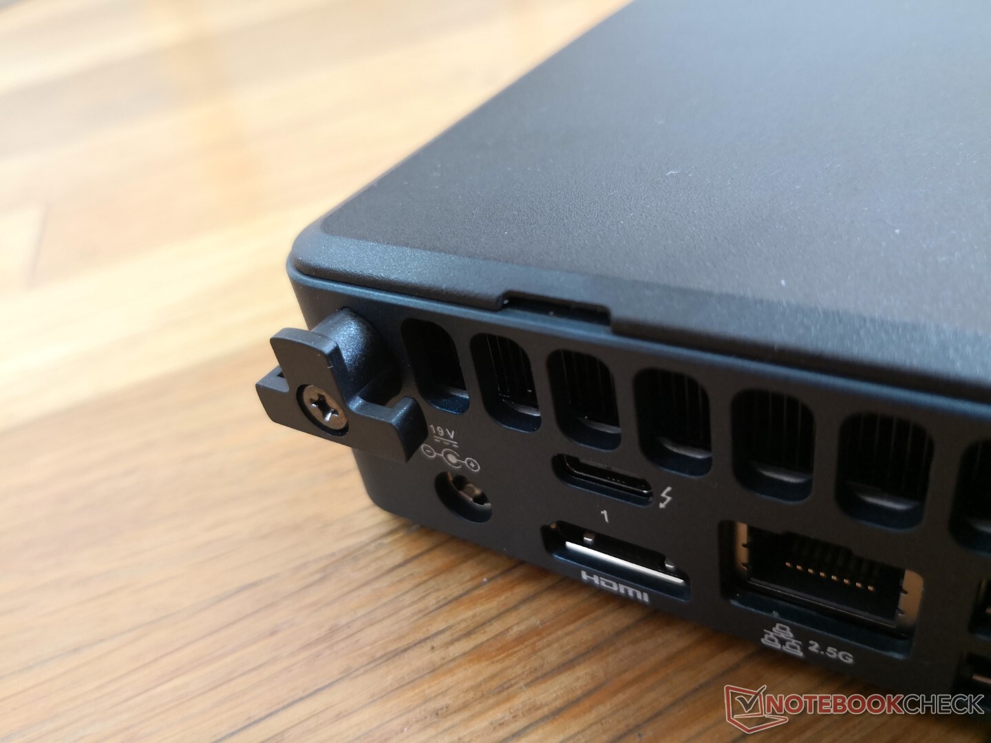 Bijna alle poorten zijn dicht opeengepakt langs de achterkant, inclusief de ene Thunderbolt 3 poort en de andere Thunderbolt 4 poort. Helaas kan de NUC niet worden gevoed door USB-C AC-adapters en dus moeten eigenaars de bijgeleverde eigen AC-vatpoort gebruiken.