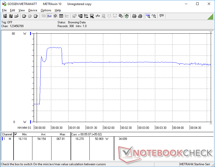 De NUC11TNKi5 verbruikt consequent meer stroom dan de NUC11PAQi7, hoewel de laatste de snellere en grotere NUC is. Gaming-belastingen zouden tussen 40 W en 44 W verbruiken, vergeleken met 31 W tot 39 W op de NUC11PAQi7. Het verbruik kan oplopen tot 74 W bij extreme verwerkingsbelastingen, maar deze belasting is slechts tijdelijk vanwege de beperkte Turbo Boost van het systeem.