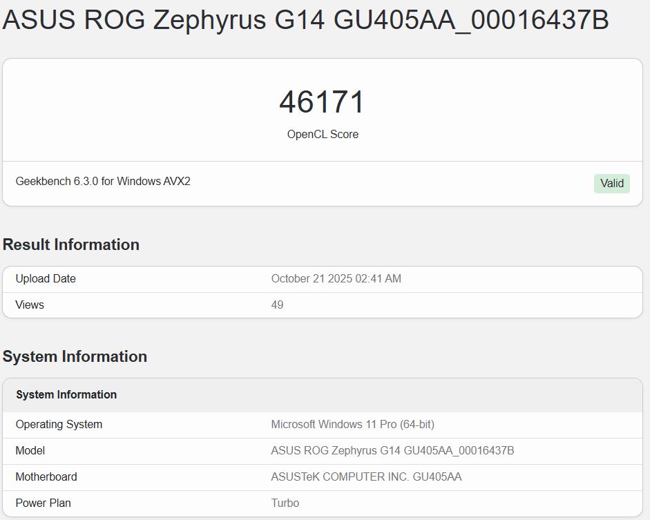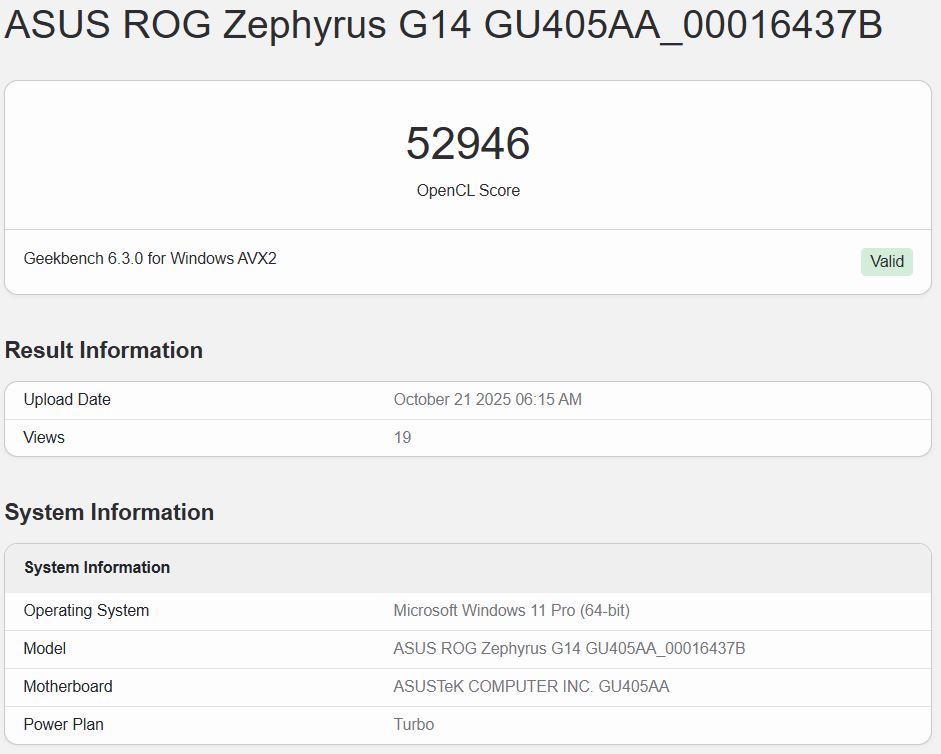 Aan de hoogste kant scoorde de iGPU van de Core Ultra X7 358H in de ROG Zephyrus G14 52.946 in de Geekbench 6.5 OpenCL benchmark. Aan de laagste kant was de score 46.171. Er zijn ook andere noteringen met scores die tussen deze twee cijfers in liggen.