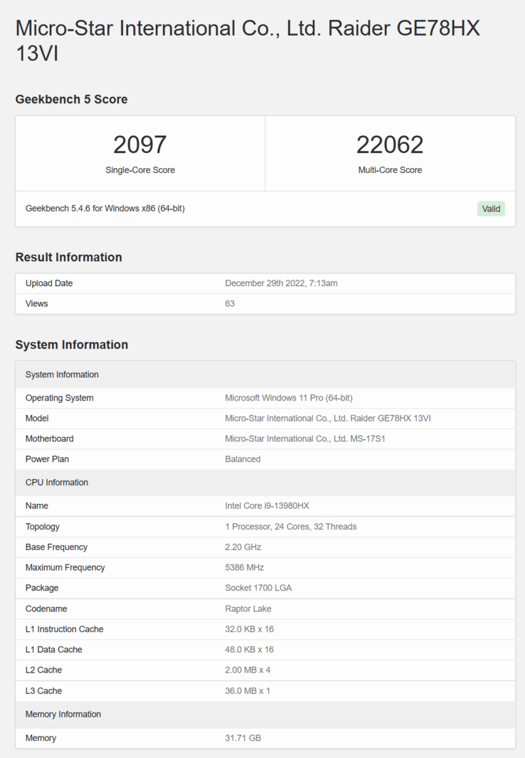 De Core i9-13980HX is een 24-core 32-thread onderdeel met boosts tot 5,6 GHz. De Raptor Lake-HX Core i9-13980HX in de MSI Raider GE78 HX lijkt 2.097 punten te hebben gescoord in single-core en 22.062 punten in multi-core tests, waarvan de laatste tot de hoogste scores van deze processor in de database tot nu toe lijkt te behoren. De processor wordt tijdens deze test opgevoerd tot 5,56 GHz.
