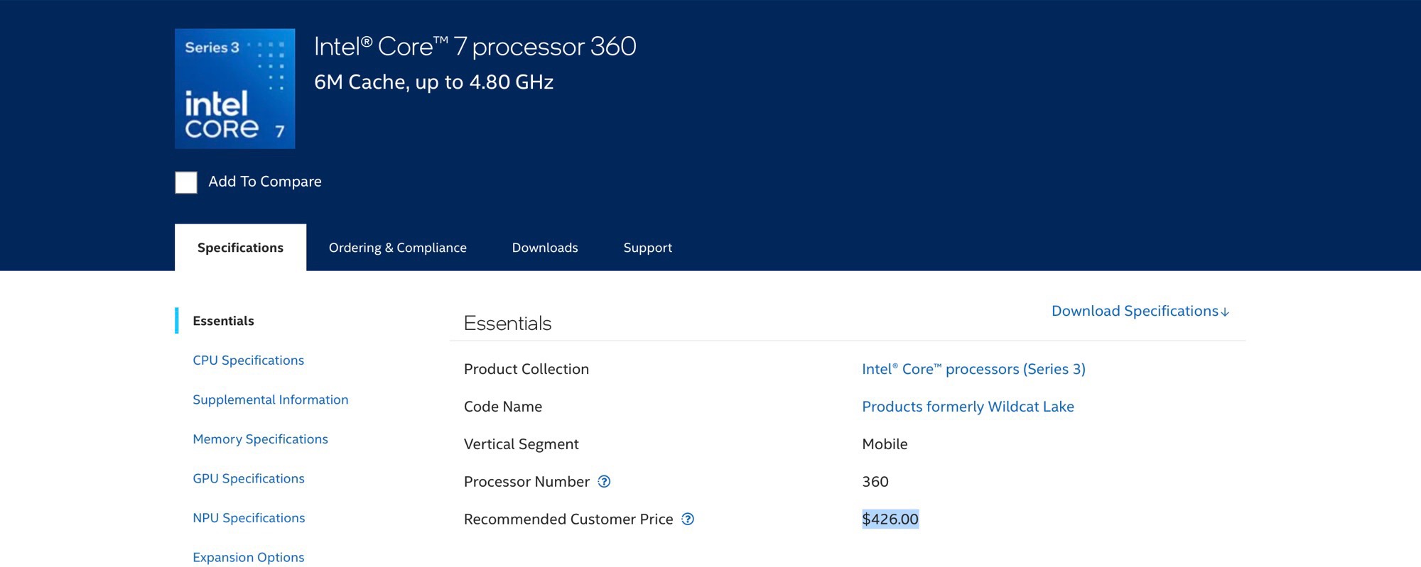 Hieruit blijkt dat een Intel Core 5 320 $340 kosten, terwijl Intel $426 rekent voor een Core 7 360. Deze prijzen gelden voor een aankoop van 1.000 eenheden; kortingen zijn waarschijnlijk bij aankoop van grotere hoeveelheden. De chips zijn dus verrassend duur, aangezien Intel's prestatiegerichte laptopprocessors een paar jaar geleden nog tegen vergelijkbare prijzen werden aangeboden. Intel noemt geen prijzen voor snellere "Panther Lake" chips