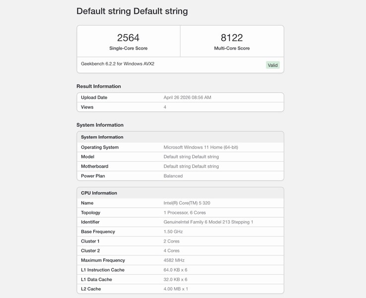 De eerste notebooks met Intel Core 5 320 zijn al gebenchmarkt op Geekbench. Met een single-thread score van 2.564 punten en een multi-core resultaat van 8.122 punten is de chip bijna twee keer zo snel als AMD's goedkopere Ryzen 5 7520Umaar ook 11,1 procent langzamer dan de Apple MacBook Neo($589 op Amazon). De Intel Core Ultra 5 325 is 36 procent krachtiger
