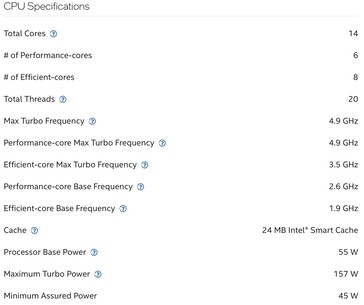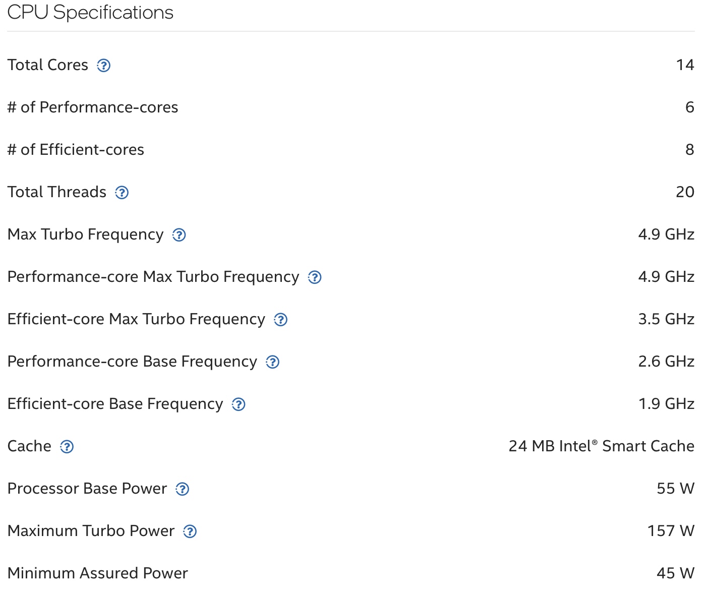 De lay-out is exact hetzelfde, met een 14-core opstelling bestaande uit zes krachtige en acht zeer efficiënte kernen. De maximale P-core kloksnelheid is ook ongewijzigd gebleven, met een maximale turbofrequentie van 4,9 GHz. De boost-klok van de E-core is met 100 MHz verlaagd, en is nu maximaal 3,5 GHz. De CPU heeft 24 MB slimme cache en een TDP van 157 watt.