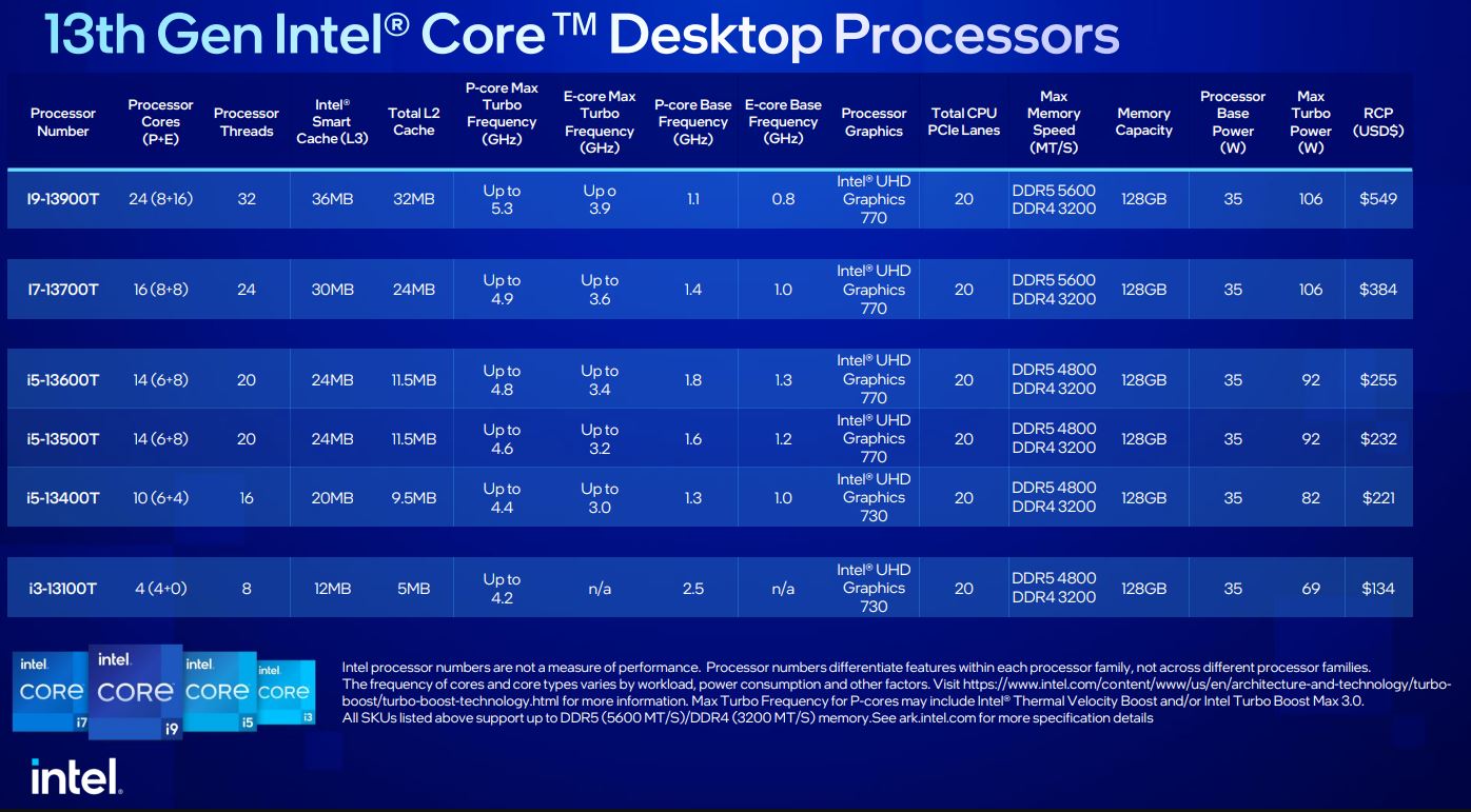 Naast de bovengenoemde 65 W CPU's heeft Intel ook 35 W Raptor Lake T-serie chips aangekondigd. De CPU's omvatten de Core i9-13900T, Core i7-13700T, Core i5-13600T/13500T/13400T en Core i3-13100T. De processoren uit de T-serie hebben dezelfde kerntellingen, L3/L2-caches en prijzen als hun overeenkomstige niet-T-tegenhangers. Het enige verschil tussen de T en niet-T Raptor Lake CPU's zijn de klokfrequenties en vermogenswaarden.