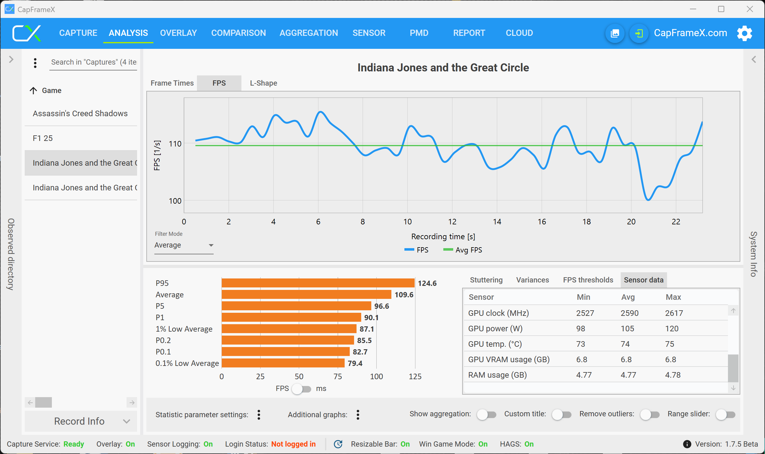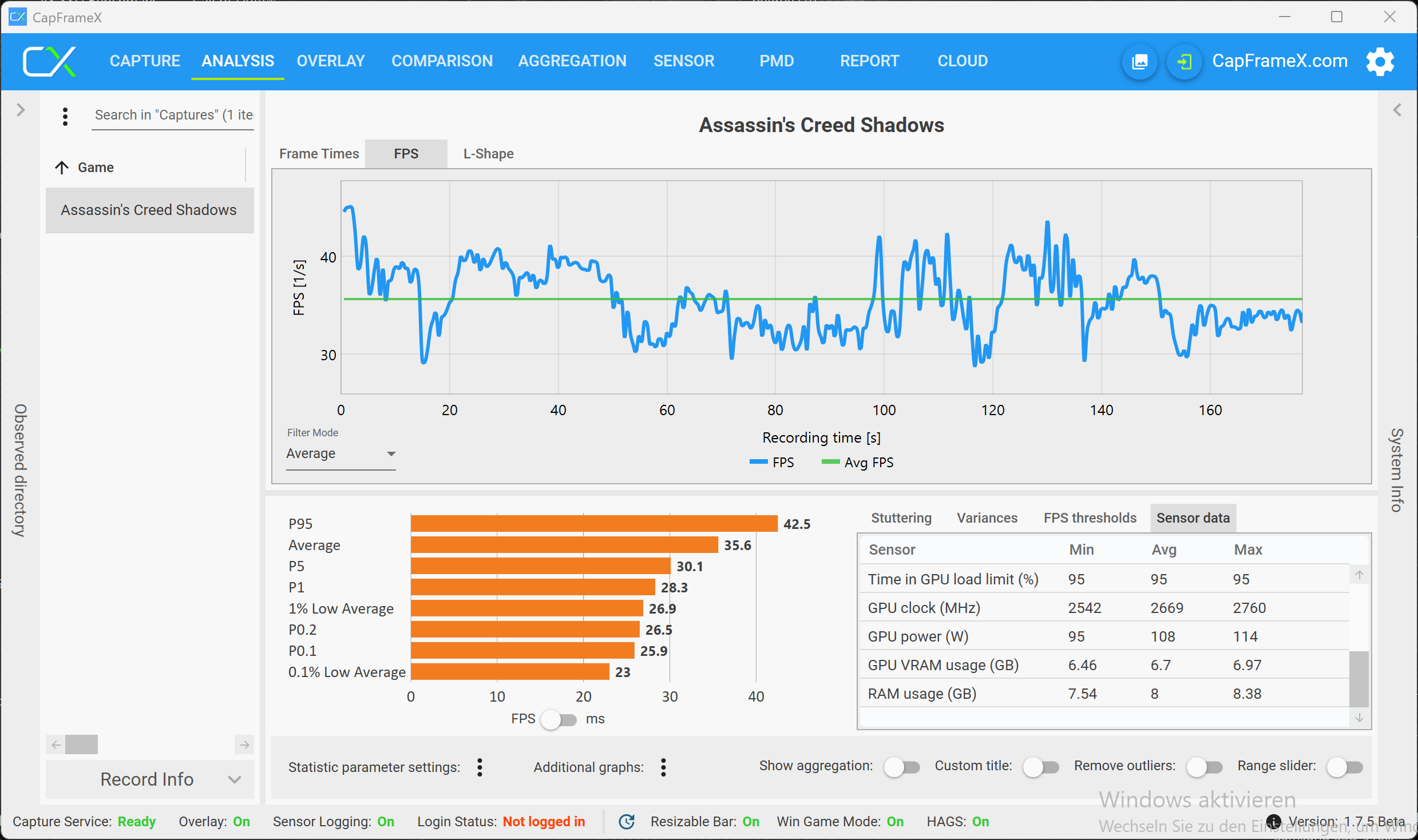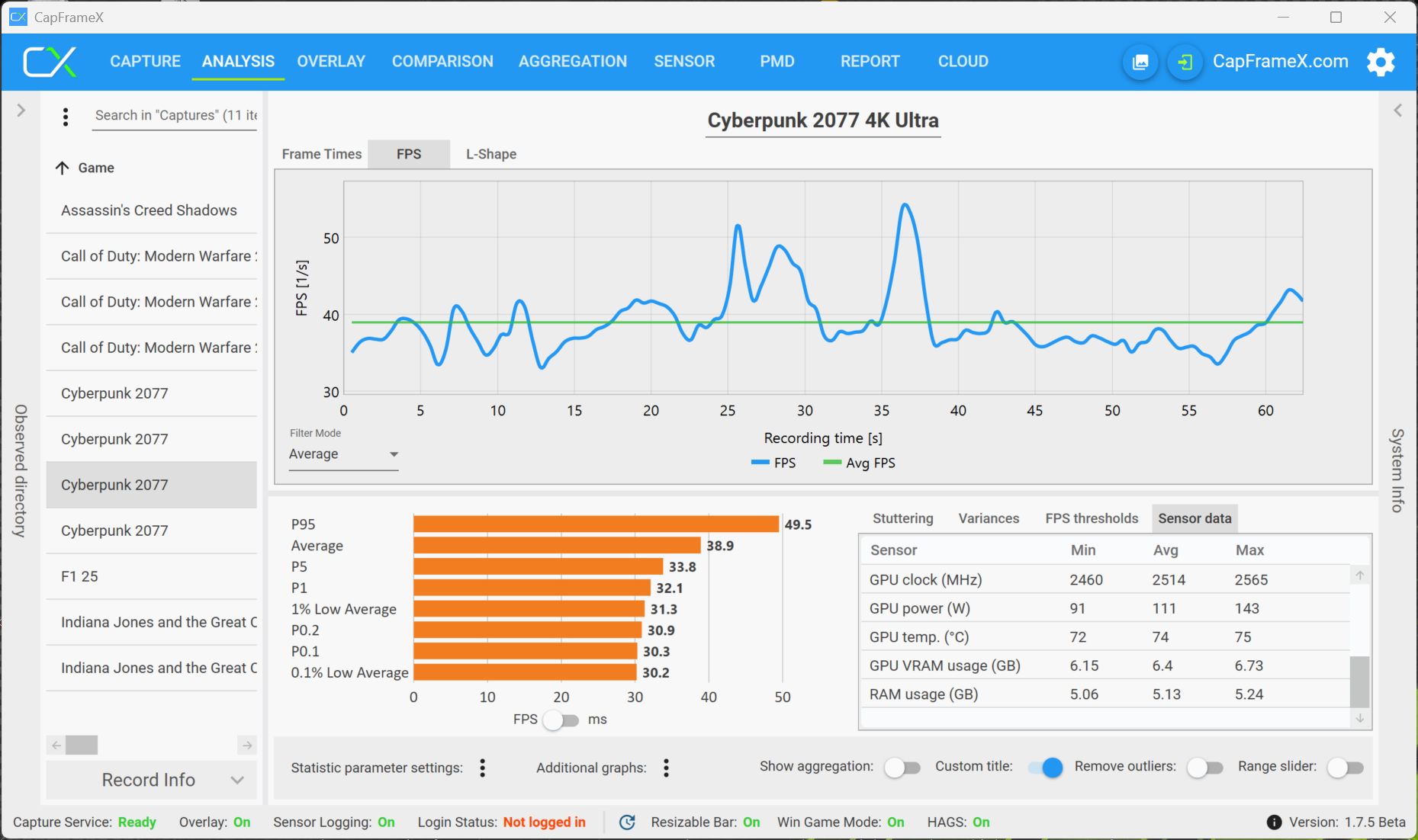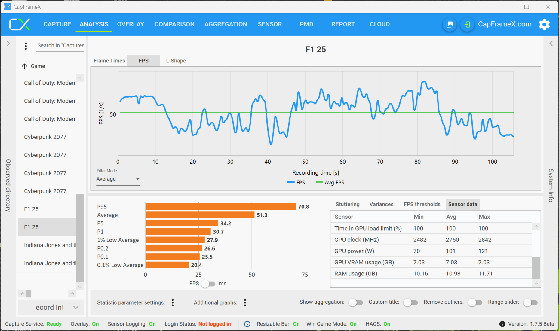 Onze belangrijkste focus in dit artikel ligt echter niet op de pure prestaties, maar op de vraag of de beschikbare hoeveelheid VRAM beperkingen oplevert bij het spelen van games, zoals stotteringen of framedrops, of prestatieverlies als u langere tijd speelt. Naast geïntegreerde benchmarks hebben we voornamelijk de prestatiecijfers opgenomen en geanalyseerd met de tool CapFrameX. We begonnen onze tests met de RTX 5070 laptop (8 GB VRAM) en schakelden over naar de RTX 5070 Ti laptop met 12 GB VRAM toen we problemen opmerkten.