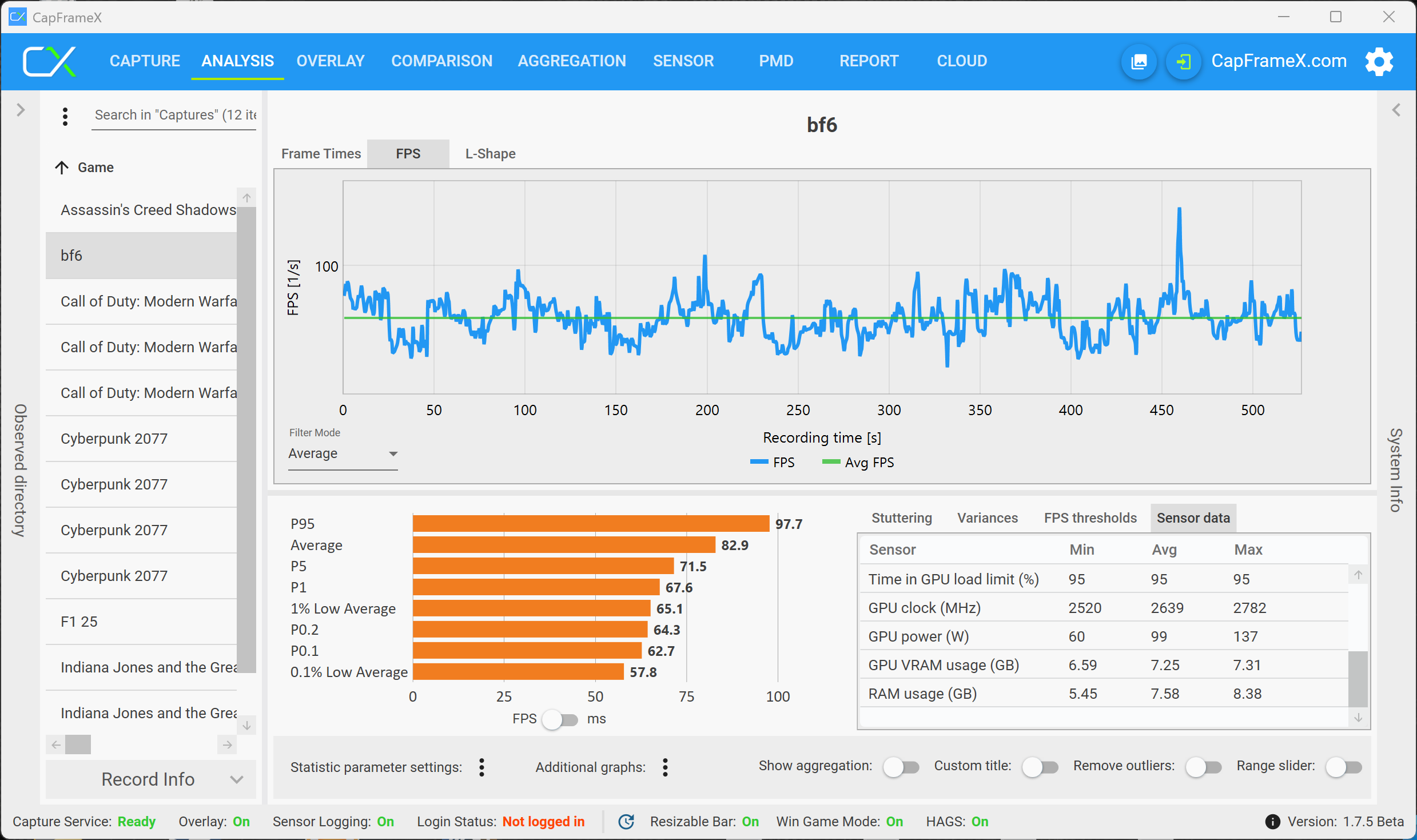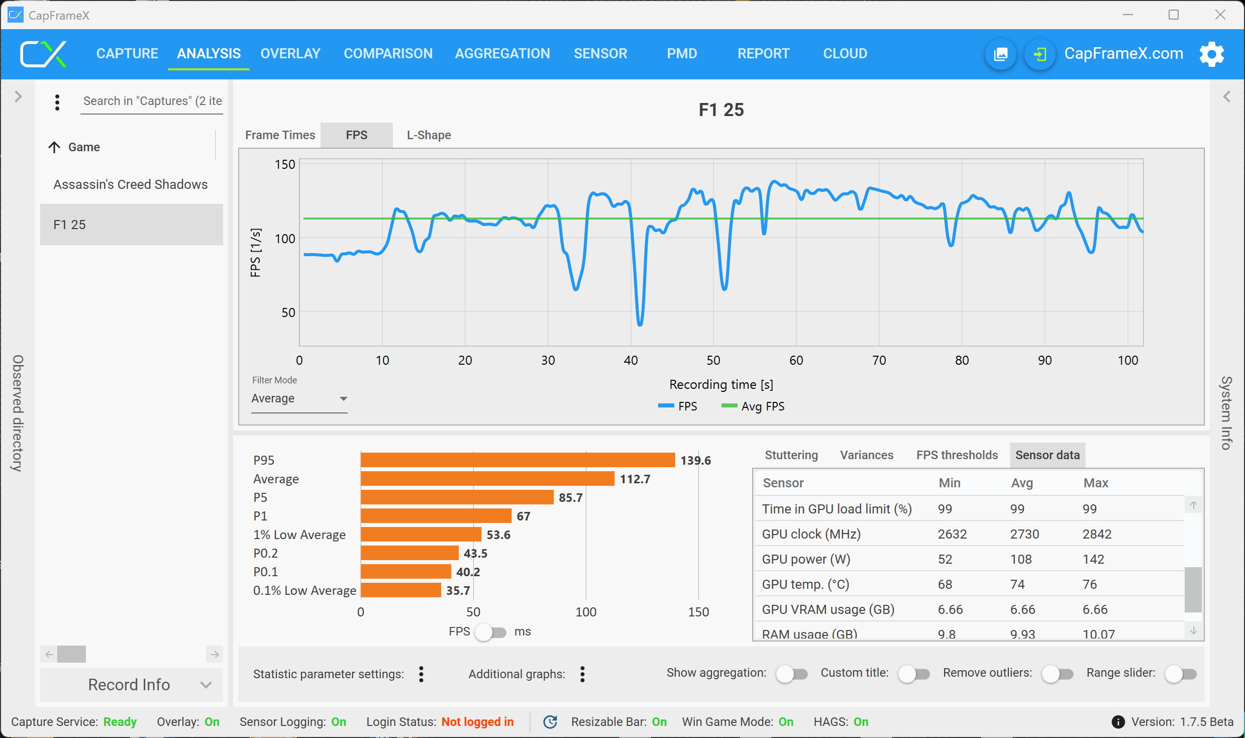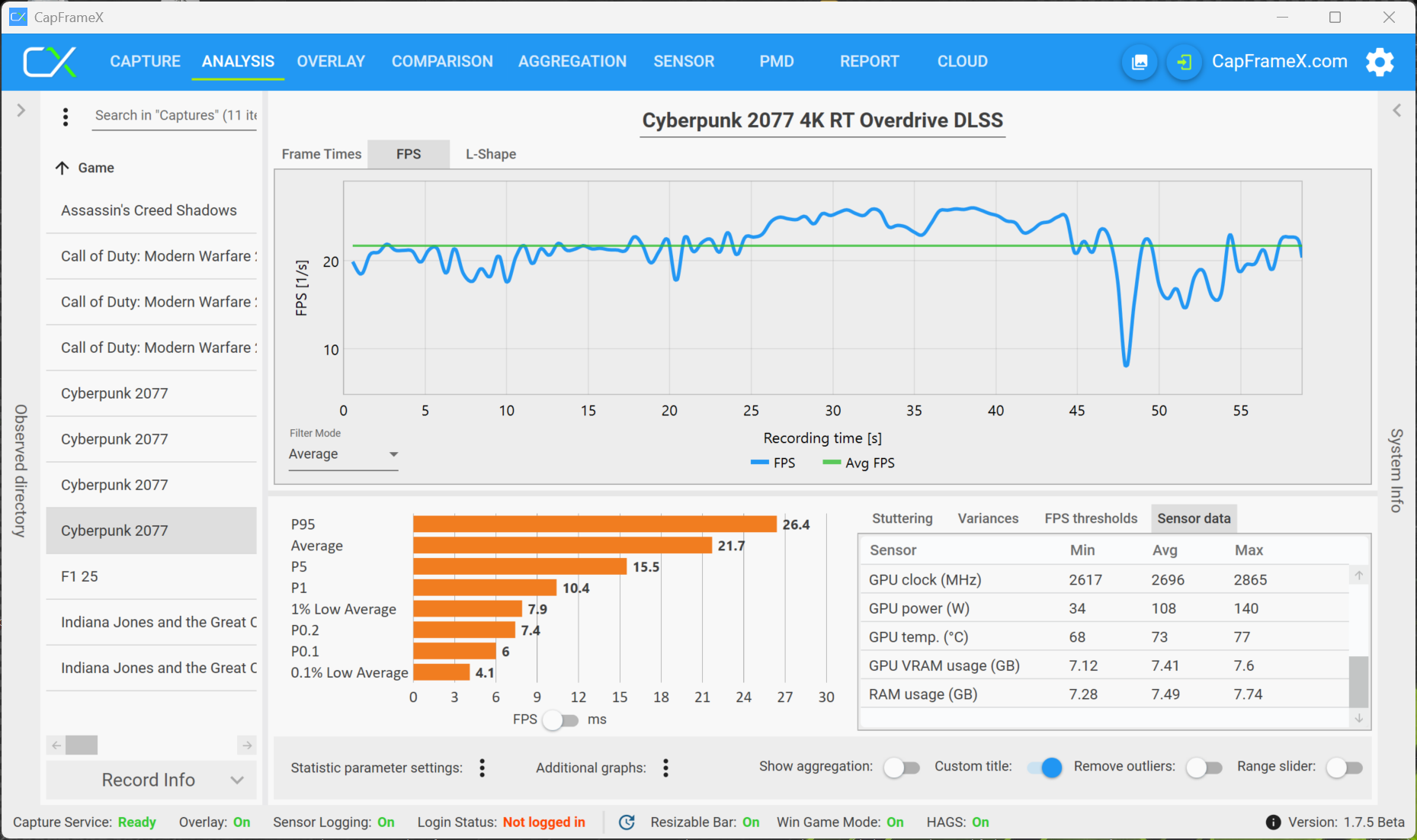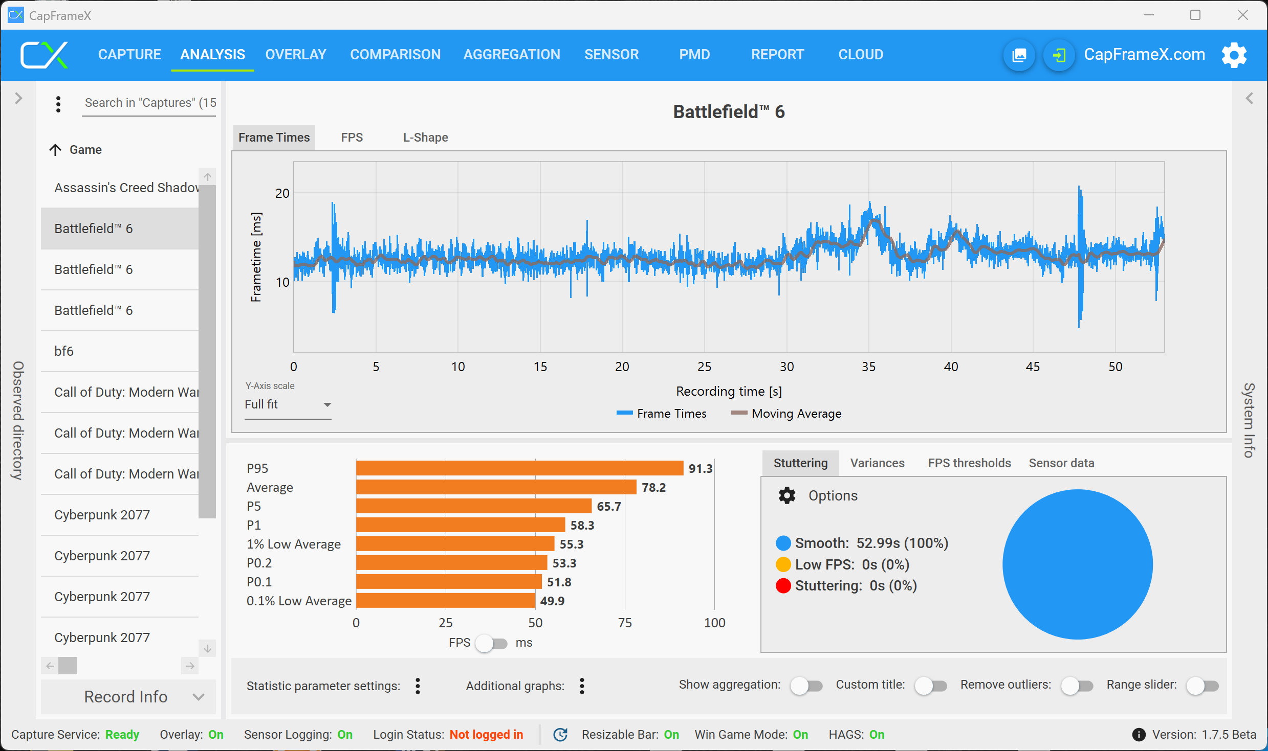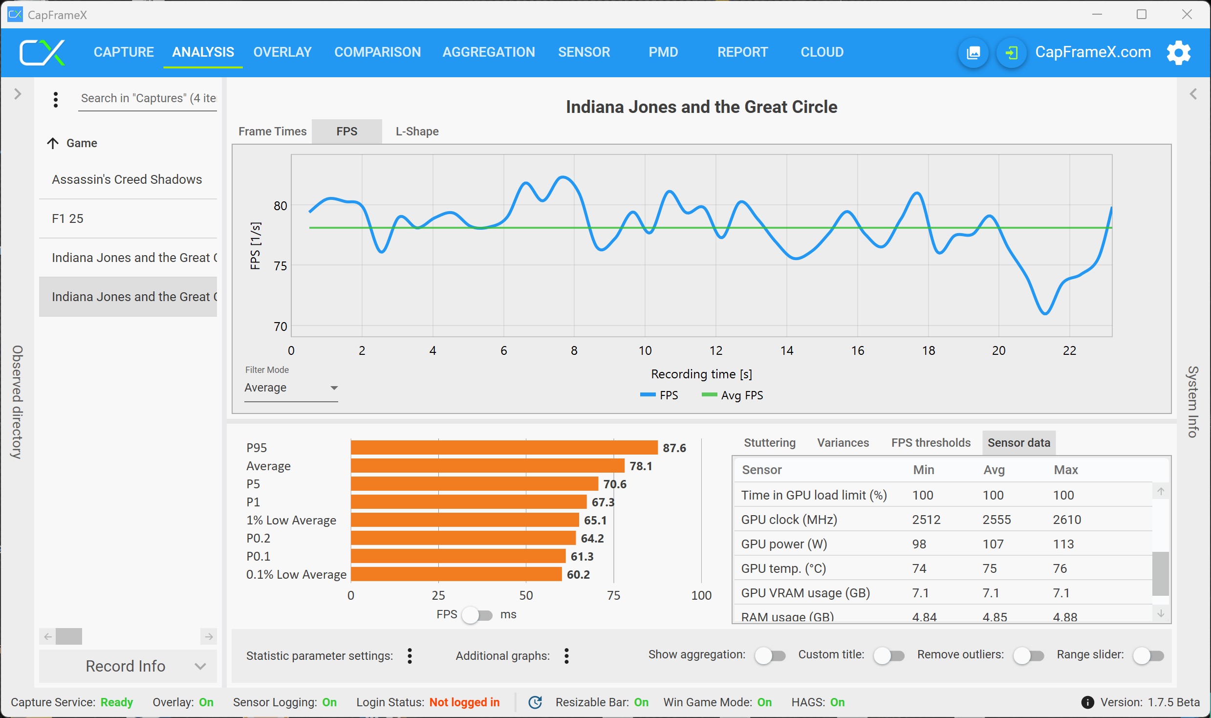 Onze belangrijkste focus in dit artikel ligt echter niet op de pure prestaties, maar op de vraag of de beschikbare hoeveelheid VRAM beperkingen oplevert bij het spelen van games, zoals stotteringen of framedrops, of prestatieverlies als u langere tijd speelt. Naast geïntegreerde benchmarks hebben we voornamelijk de prestatiecijfers opgenomen en geanalyseerd met de tool CapFrameX. We begonnen onze tests met de RTX 5070 laptop (8 GB VRAM) en schakelden over naar de RTX 5070 Ti laptop met 12 GB VRAM toen we problemen opmerkten.