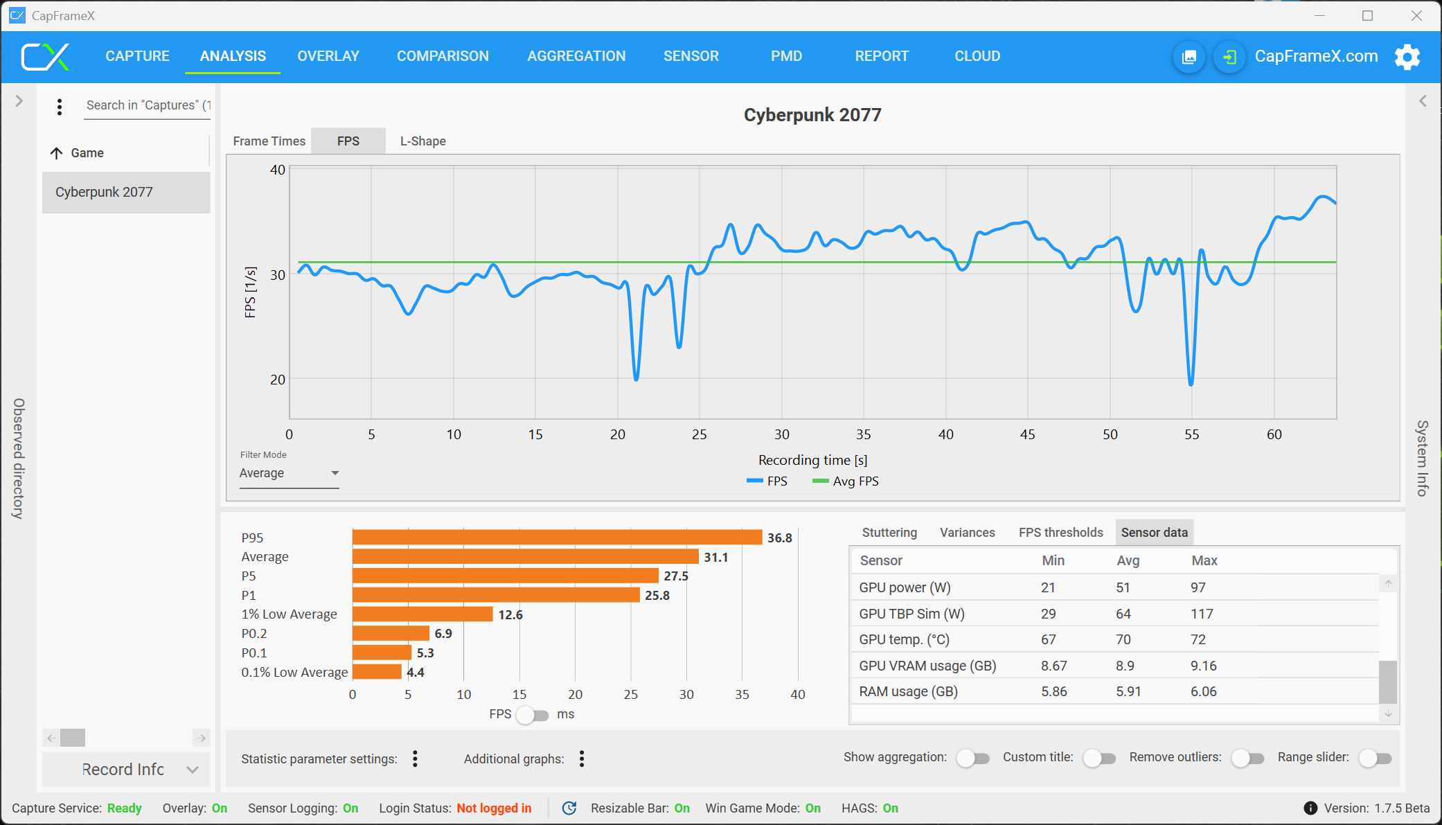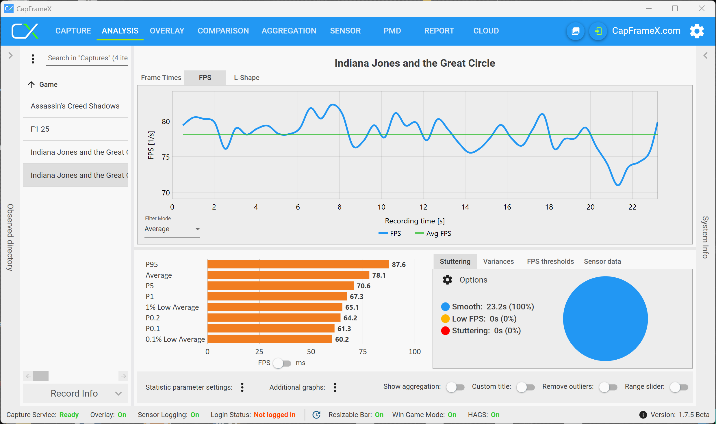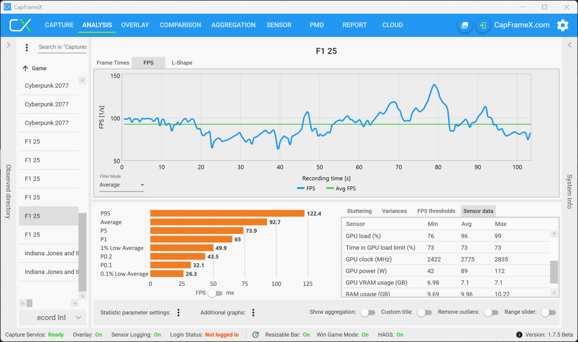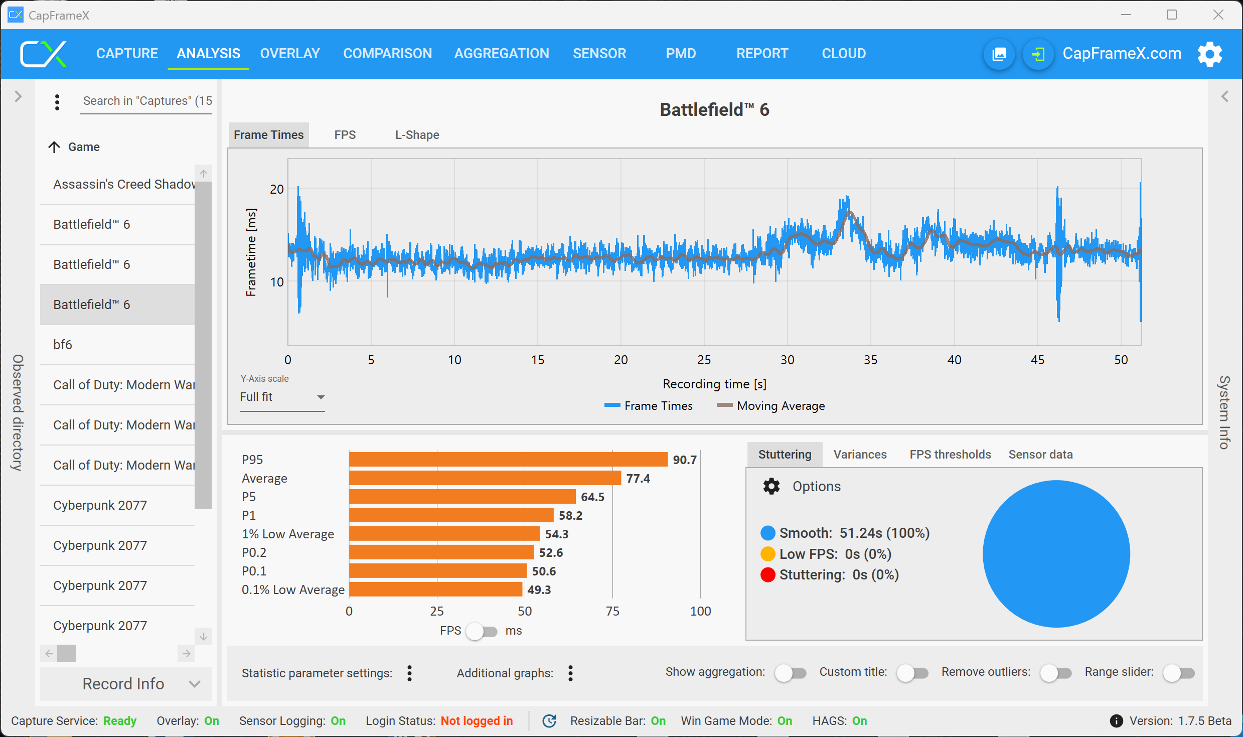 Onze belangrijkste focus in dit artikel ligt echter niet op de pure prestaties, maar op de vraag of de beschikbare hoeveelheid VRAM beperkingen oplevert bij het spelen van games, zoals stotteringen of framedrops, of prestatieverlies als u langere tijd speelt. Naast geïntegreerde benchmarks hebben we voornamelijk de prestatiecijfers opgenomen en geanalyseerd met de tool CapFrameX. We begonnen onze tests met de RTX 5070 laptop (8 GB VRAM) en schakelden over naar de RTX 5070 Ti laptop met 12 GB VRAM toen we problemen opmerkten.