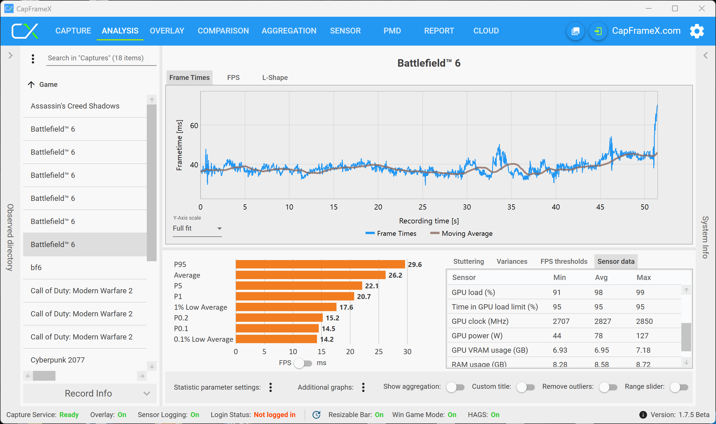 Battlefield 6 is een interessant geval, omdat u gemakkelijk het aantal fps (zelfs verdeeld over CPU/GPU) en ook het VRAM-gebruik kunt controleren met de geïntegreerde bewakingstools. We zijn begonnen met de Full-HD resolutie en de voorinstelling Overkill, waarbij de VRAM-belasting begint bij iets minder dan 7 GB.