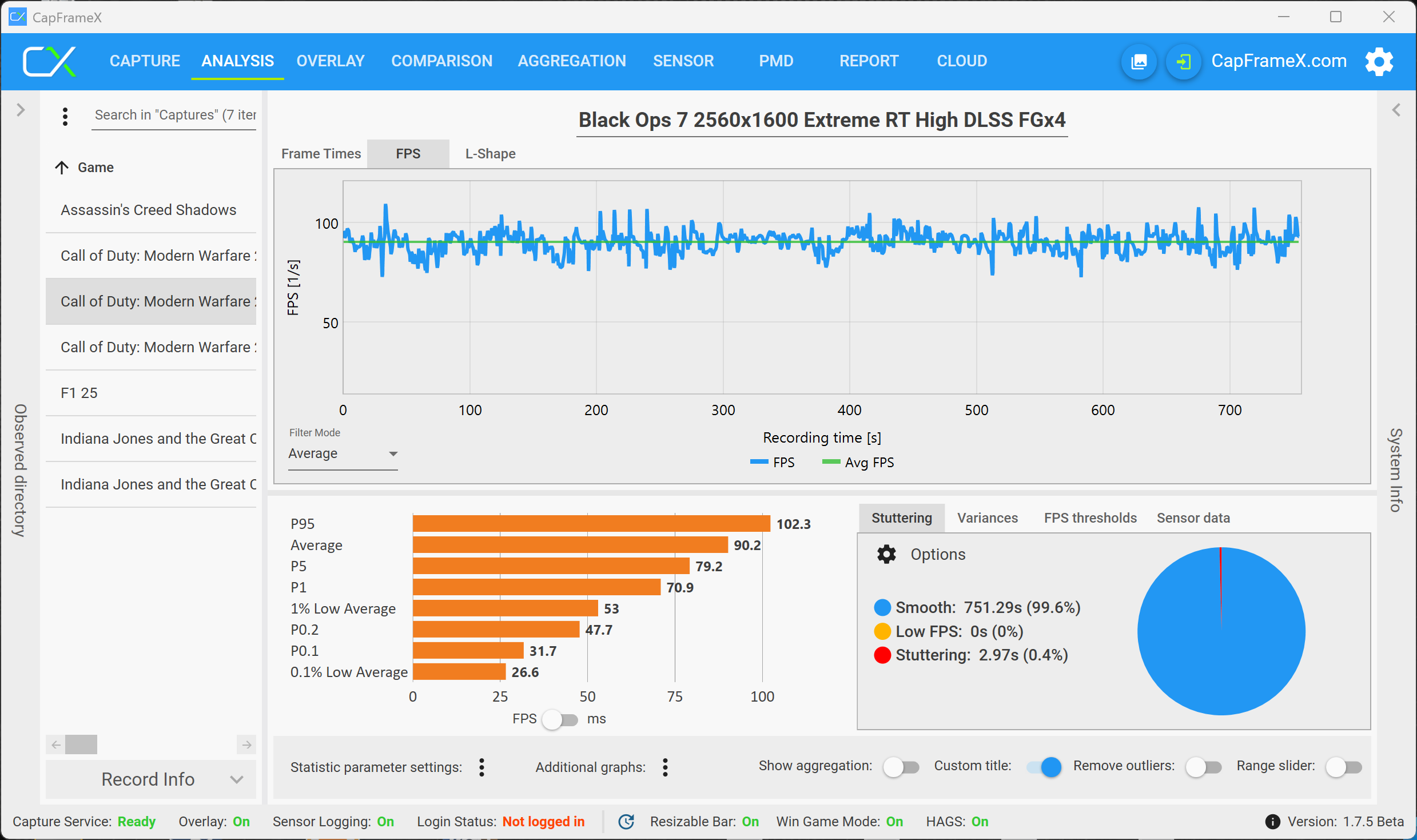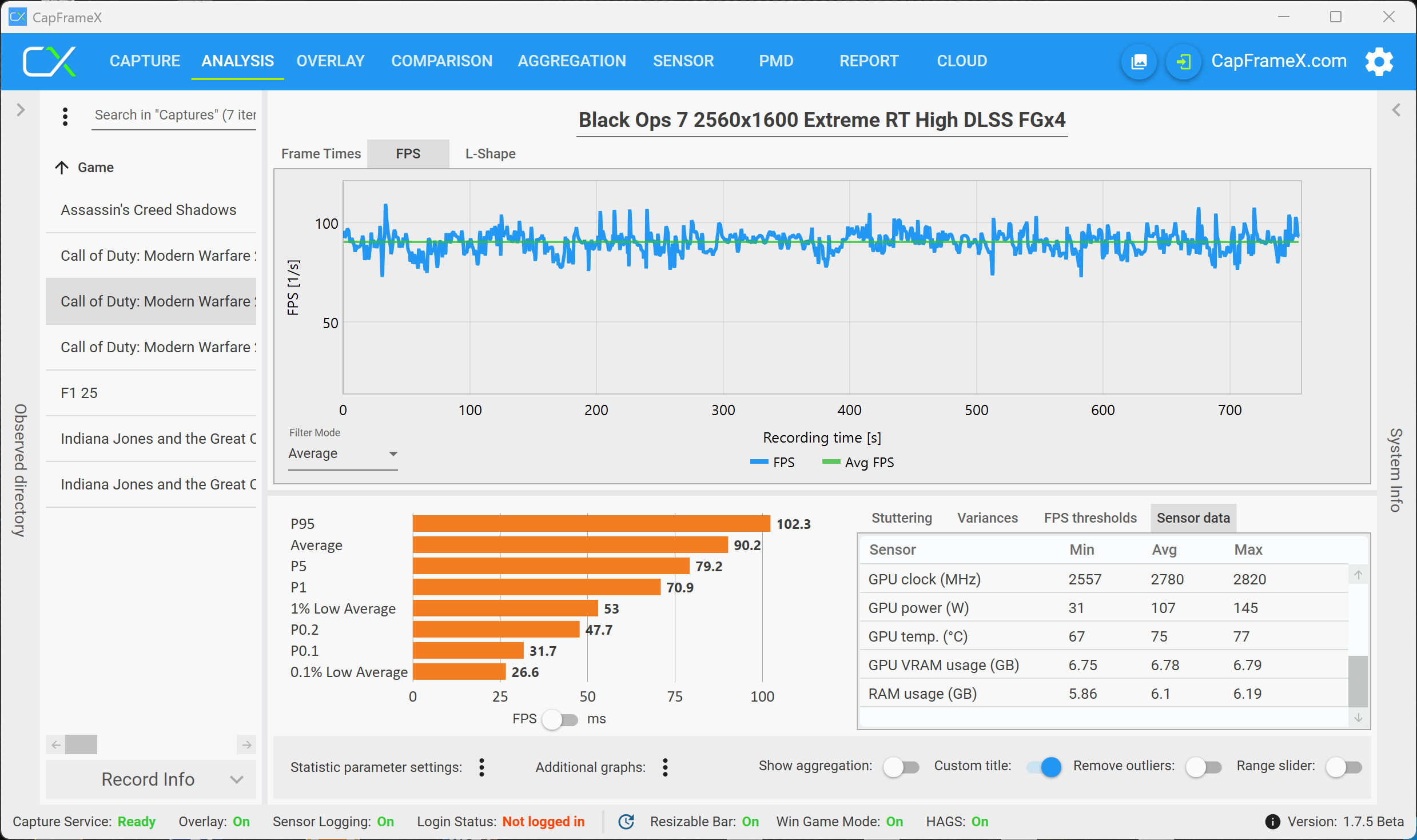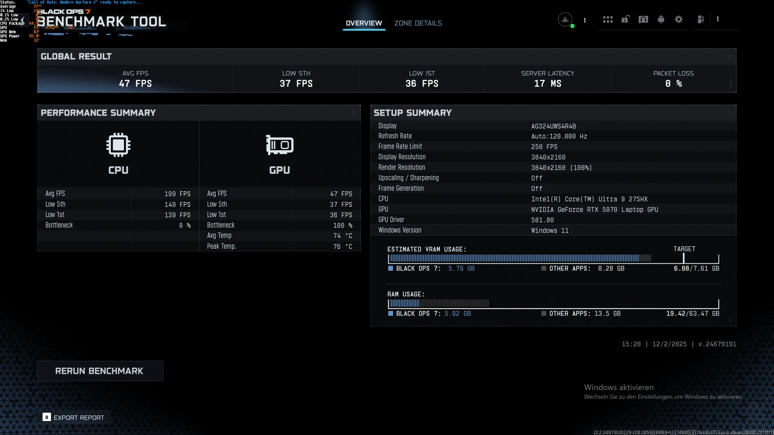 Het feit dat er een VRAM-waarschuwing is, betekent echter niet dat u per se problemen ondervindt tijdens het gamen. Met maximale belasting voor de RTX 5070 (hoogste VRAM-belasting, maar nog steeds soepel speelbaar), gebruikten we de instelling 2560 x 1600 pixels, Raytracing (High), DLSS en Frame Generation (QHD RT is niet speelbaar zonder DLSS, maar tegelijkertijd is 4K met RT niet altijd boven de 30 fps, ondanks DLSS en MFGx4) en speelden we de multiplayer. De volgende analyse toont als voorbeeld een multiplayerwedstrijd, en laat duidelijk zien dat er geen beperkingen zijn. De RTX 5070 Ti met 12 GB VRAM heeft geen problemen met de 4K resolutie.