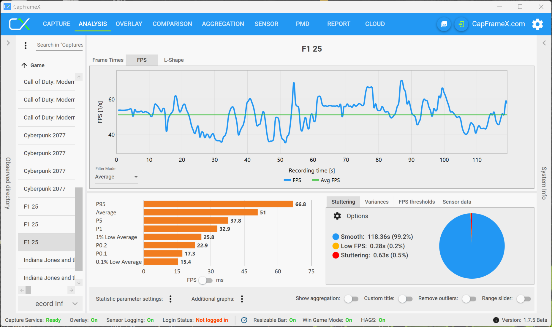 F1 2025 is een zeer veeleisende titel en de hoge grafische instellingen (vanaf Ultra), waarbij Raytracing standaard actief is, zijn ook een uitdaging voor high-end GPU's. Om soepele gameplay te garanderen met de RTX 5070 laptop, moet u de instellingen beperken tot de High preset, die zelfs in de QHD-resolutie zeer goed zal werken. De 4K-resolutie is al een uitdaging voor de 5070 laptop, omdat de framerate soms al onder de 30 fps zakt, maar er zijn geen VRAM-problemen.