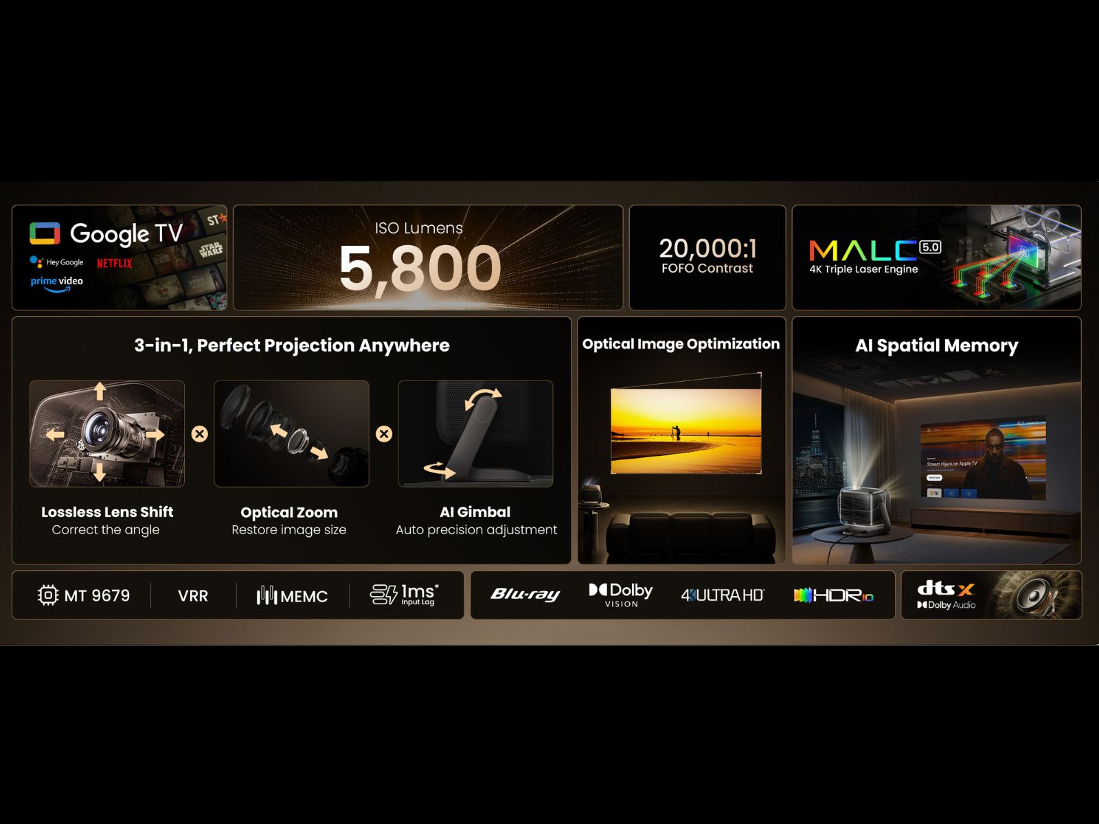 Extra slimme functies zijn onder andere automatische schermaanpassing, autofocus, obstakelvermijding, muurkleuraanpassing en oogbeschermingsmechanismen, die allemaal via realtime AI-aanpassingen worden afgehandeld. De projector draait op een op Google gebaseerd systeem en bevat 4GB RAM met 64GB interne opslag.