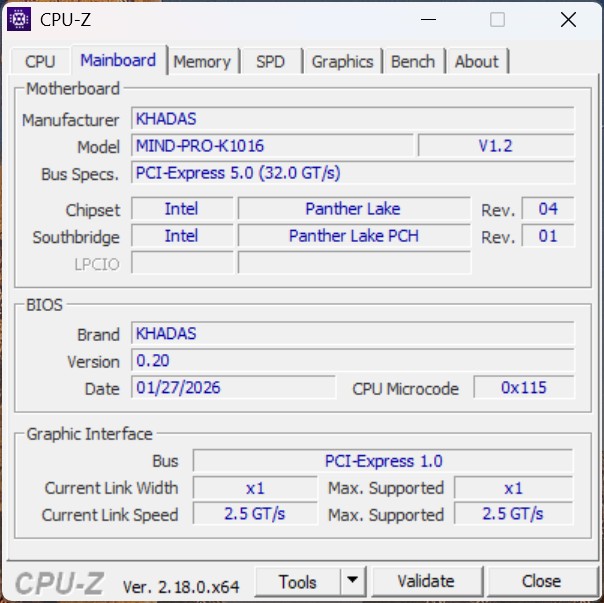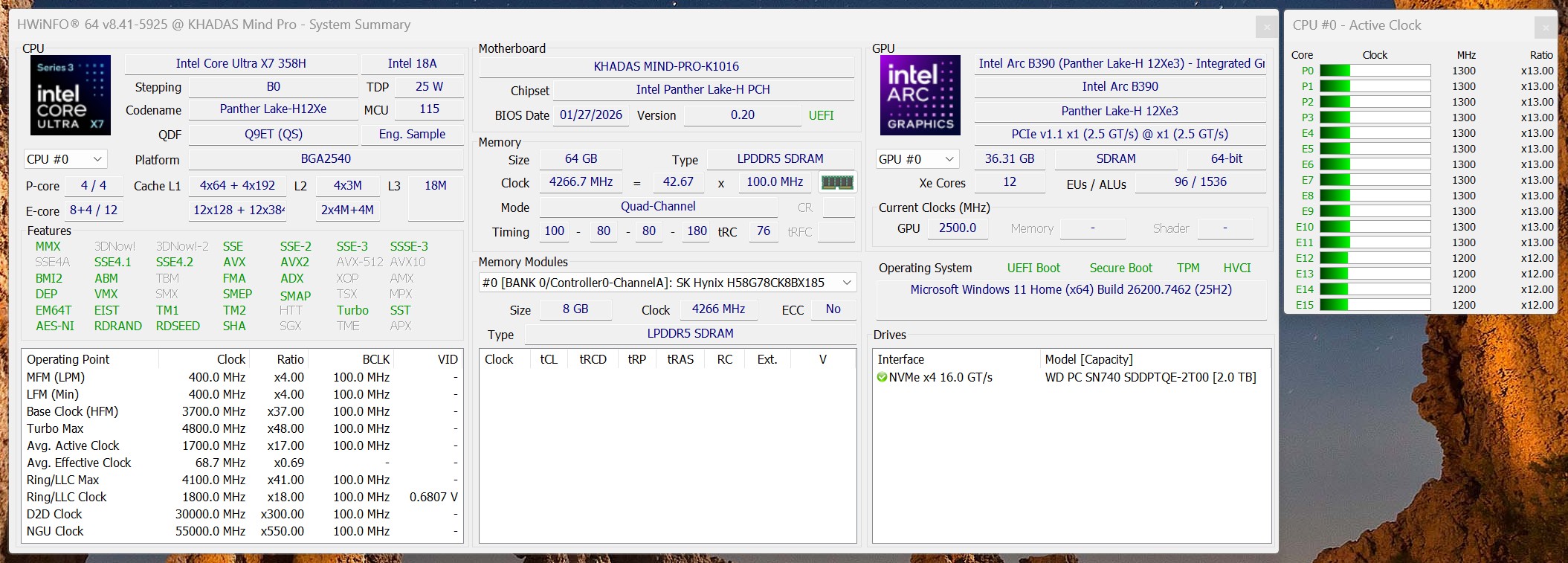 | Khadas Mind Pro Intel Core Ultra X7 358H ⎘ Intel Arc B390 12 Xe3 Panther Lake iGPU ⎘ 64 GB Geheugen, 2048 GB SSD | Catalogusprijs: 1799€ | 566 g | 105 x 146 x 58 mm | |