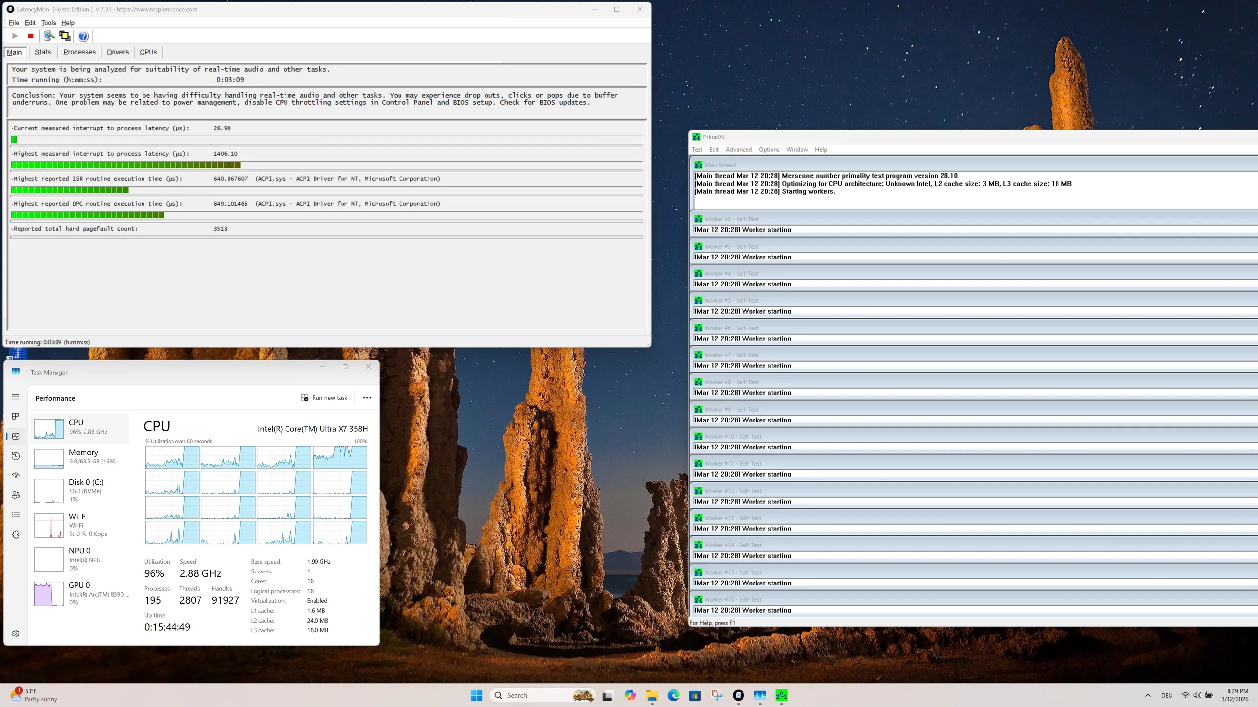 De prestaties van de Intel Core Ultra X7 358H dalen licht onder langdurige belasting, wat goed te zien is in de Cinebench R15 multi-loop. Gemiddeld werkt de processor met een stroomverbruik van ongeveer 45 watt, terwijl de temperaturen kunnen oplopen tot 97 C op het hoogtepunt.