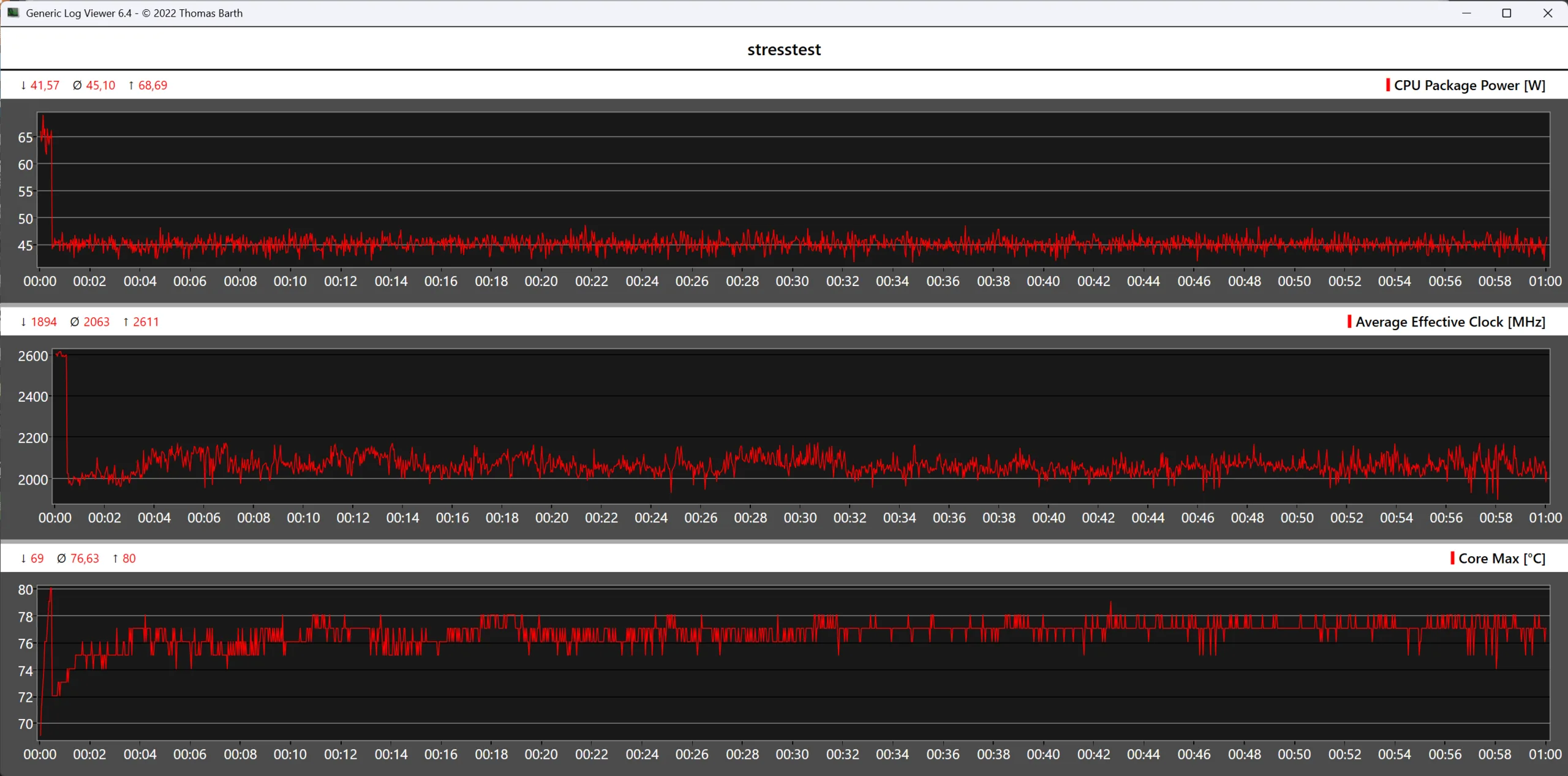 In de stresstest bereikt de Intel Core Ultra X7 358H kortstondig temperaturen tot 80 C, wat nog steeds niet kritisch is gezien de maximumtemperatuur die Intel opgeeft. Met een gemiddeld stroomverbruik van ongeveer 45 watt stabiliseerde de CPU-temperatuur zich vervolgens rond de 76 C. De SoC werd echter iets heter in de Cinebench R15 multitest (97 C).