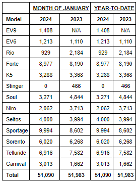 Kia America leverde 51.090 eenheden in januari 2024, onder vermelding van groei in haar SUV's, bedrijfswagens en EV's. SUV's waren goed voor 74% van de verkopen van het bedrijf in januari, waaronder 1.408 eenheden van de nieuwe EV9. Dit was ook een stijging ten opzichte van het verkoopvolume van 1.113 in december. De EV6 werd ook opgemerkt, met een verkoopstijging van 9% ten opzichte van januari vorig jaar, tot 1.213 exemplaren. Het aantal verkochte Kia Niro EV's werd niet vermeld, omdat deze naast de hybride versies van de Niro worden meegerekend. Andere niet-elektrische modellen die de verkoop hebben gestimuleerd zijn onder andere de Carnival, Sportage en Forte.