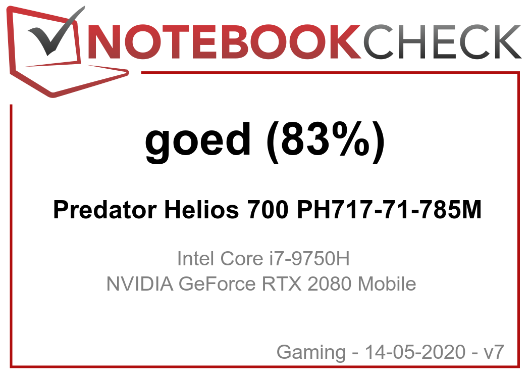Waarschuwing: De Predator Helios 700 is een van de eerste game notebooks die geëvalueerd zijn gebaseerd op de verlengde (en uitgebreidere) v7 beoordelingsmethode. Hierdoor lijkt het dus dat deze laptop slechtere resultaten heeft vergeleken met zijn recent geteste high-end concurrenten. In de toekomst moeten alle nieuwe game notebooks de v7 beoordeling doorstaan.