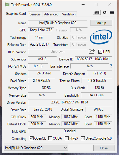 | Asus ZenBook S UX391U i5-8550U, UHD Graphics 620, Samsung PM961 NVMe MZVLW512HMJP, IPS, 1920x1080, 13.3" | Dell XPS 13 9370 FHD i5 i5-8250U, UHD Graphics 620, Toshiba XG5 KXG50ZNV256G, IPS, 1920x1080, 13.3" | HP Spectre 13-af033ng i5-8550U, UHD Graphics 620, Samsung PM961 NVMe MZVLW512HMJP, IPS, 1920x1080, 13.3" | Huawei Matebook X Pro i5 i5-8250U, GeForce MX150, Samsung PM961 MZVLW256HEHP, IPS, 3000x2000, 13.9" | Huawei MateBook X i5-7200U, HD Graphics 620, LITEON CB1-SD256, , 2160x1440, 13.3" | Apple MacBook Pro 13 2017 i5-7360U, Iris Plus Graphics 640, Apple SSD AP0128, IPS, 2560x1600, 13.3" | Gemiddeld Intel UHD Graphics 620 | Gemiddelde van klas Subnotebook | |