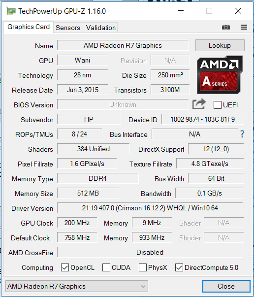 | HP 15-ba077ng A12-9700P, Radeon R7 (Bristol Ridge) | Lenovo Ideapad 310-15IKB i5-7200U, HD Graphics 620 | HP 15-ay116ng i5-7200U, HD Graphics 620 | Acer Aspire E15 E5-553G-109A A12-9700P, Radeon R8 M445DX | HP Pavilion 15-aw004ng W8Y60EA A10-9600P, Radeon R8 M445DX | Asus F555UB-XO043T 6200U, GeForce 940M | Dell Latitude 15-3570 6200U, HD Graphics 520 | |