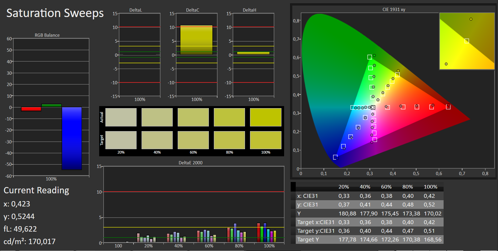| Color Space (Percent of AdobeRGB 1998) (%) | 58 | 60.9 5% | 78.4 35% | 50.48 -13% | 55 -5% | 61.56 6% |