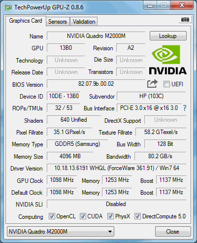 | HP ZBook 15 G3 Intel Xeon E3-1505M v5, NVIDIA Quadro M2000M | Lenovo ThinkPad P50 Intel Core i7-6820HQ, NVIDIA Quadro M2000M | Dell Precision 5510 Intel Xeon E3-1505M v5, NVIDIA Quadro M1000M | HP ZBook 15 G2 Intel Core i7-4910MQ, AMD FirePro M5100 | MSI WS60-6QJE316H11 Intel Xeon E3-1505M v5, NVIDIA Quadro M2000M | |