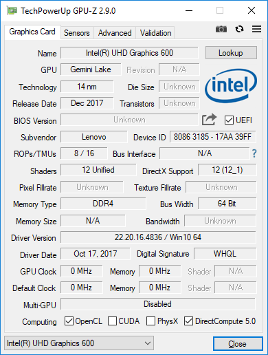 | Lenovo Flex 6-11IGM UHD Graphics 600, Celeron N4000, SanDisk DF4064 | Apple MacBook Air 11 inch 2015-03 HD Graphics 6000, 5250U, Apple SSD SM0128F | Lenovo Ideapad 120s-11IAP HD Graphics 500, Celeron N3350, 64 GB eMMC Flash | HP Pavilion x360 11t T5M27AV HD Graphics 405 (Braswell), N3710, Toshiba MQ01ABF050 | Asus VivoBook Flip 12 TP203NAH-BP049T HD Graphics 505, Pentium N4200, Seagate Mobile HDD 1TB ST1000LM035 | Acer TravelMate Spin B1 118-RN-P6BE HD Graphics 505, Pentium N4200, SK Hynix HFS256G39TND-N210A | Apple MacBook 12 (Early 2016) 1.1 GHz HD Graphics 515, 6Y30, Apple SSD AP0256 | |