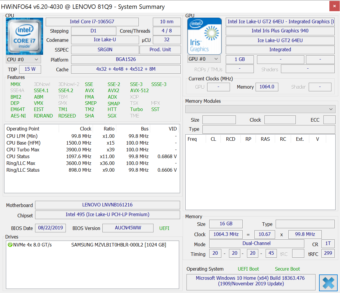 | Lenovo Yoga C940-14IIL 81Q9 Iris Plus Graphics G7 (Ice Lake 64 EU), i7-1065G7, Samsung PM981a MZVLB1T0HBLR | MSI Prestige 15 A10SC GeForce GTX 1650 Max-Q, i7-10710U, Samsung SSD PM981 MZVLB1T0HALR | Asus ZenBook S13 UX392FN GeForce MX150, i7-8565U, WDC PC SN520 SDAPNUW-512G | Lenovo Yoga C930-13IKB 81C4 UHD Graphics 620, i5-8550U, SK hynix PC401 HFS256GD9TNG | Razer Blade Stealth i7-1065G7 Iris Plus Iris Plus Graphics G7 (Ice Lake 64 EU), i7-1065G7, Samsung SSD PM981 MZVLB256HAHQ | Dell XPS 13 7390 2-in-1 Core i7 Iris Plus Graphics G7 (Ice Lake 64 EU), i7-1065G7, Toshiba BG4 KBG40ZPZ512G | |