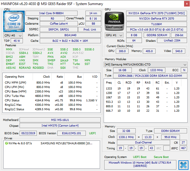 | MSI GE65 Raider 9SF-049US GeForce RTX 2070 Mobile, i9-9880H, Samsung SSD PM981 MZVLB1T0HALR | MSI GE63 Raider 8SG GeForce RTX 2080 Mobile, i7-8750H, WDC PC SN520 SDAPNUW-512G | Lenovo Legion Y740-15ICHg GeForce RTX 2070 Max-Q, i7-9750H, WDC PC SN520 SDAPMUW-128G | Asus Strix GL531GV-PB74 GeForce RTX 2060 Mobile, i7-9750H, Intel SSD 660p SSDPEKNW512G8 | Eurocom Nightsky RX15 GeForce RTX 2070 Mobile, i9-9980HK, Samsung SSD 970 Pro 512GB | Razer Blade 15 RTX 2080 Max-Q GeForce RTX 2080 Max-Q, i7-9750H, Samsung SSD PM981 MZVLB512HAJQ | |