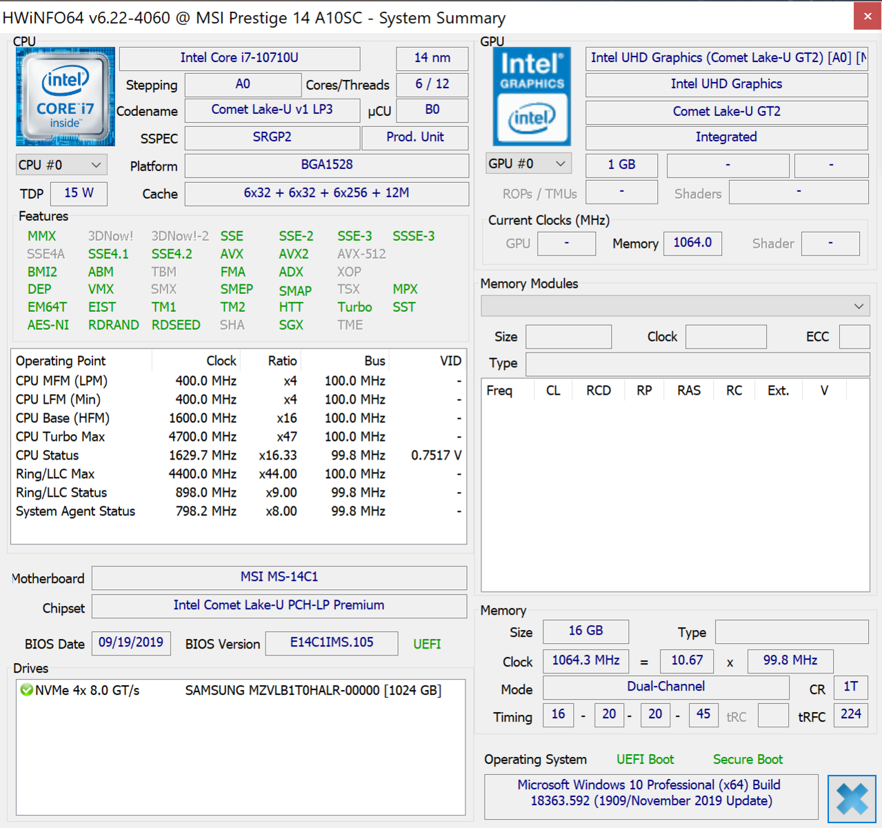 | 85.2 % v7 (old) | 11-2019 | MSI Prestige 15 A10SC i7-10710U, GeForce GTX 1650 Max-Q | 1.7 kg | 16 mm | 15.60" | 3840x2160 | |