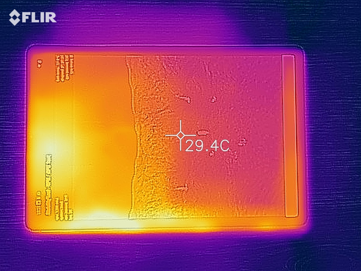 (+) Bij onbelast gebruik bedraagt de gemiddelde temperatuur voor de bovenzijde 28.8 °C / 84 F, vergeleken met het apparaatgemiddelde van 30 °C / 86 F.