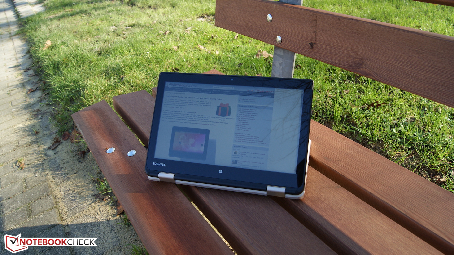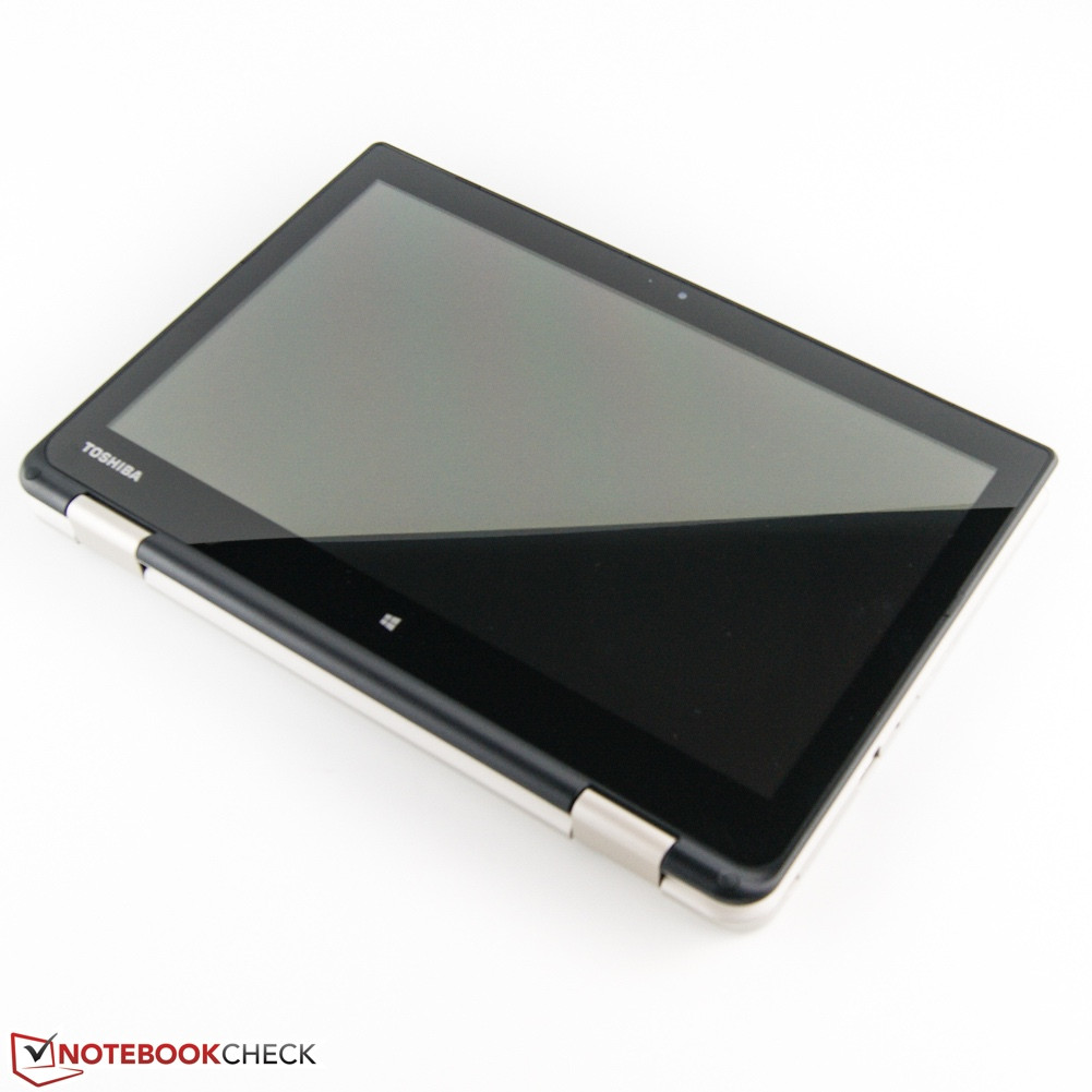 Het 360-graden scharnier spreekt in het voordeel van de flexibiliteit. De lage maximale helderheid en het glanzende beeldscherm maken het echter lastig om het apparaat buitenshuis te gebruiken. De kleine kijkhoeken zijn vooral in tablet modus vervelend. Ons testmodel is uitgerust met een 64-bit CPU. We waren tevreden over de algehele prestaties, hoewel de prestaties van de geïntegreerde GPU nogal beperkt zijn. De L10 scoort punten wat betreft geluidsproductie, omdat het apparaat geen ventilator bevat. De verwachte batterijlevensduur bij normaal gebruik is ongeveer 4 uur. Helaas biedt Toshiba geen mogelijkheden om deze looptijd te verlengen, dus kopers die op zoek zijn naar een langere batterijlevensduur, zouden eens moeten kijken naar de Asus Transformer Book (1:24 uur langer).