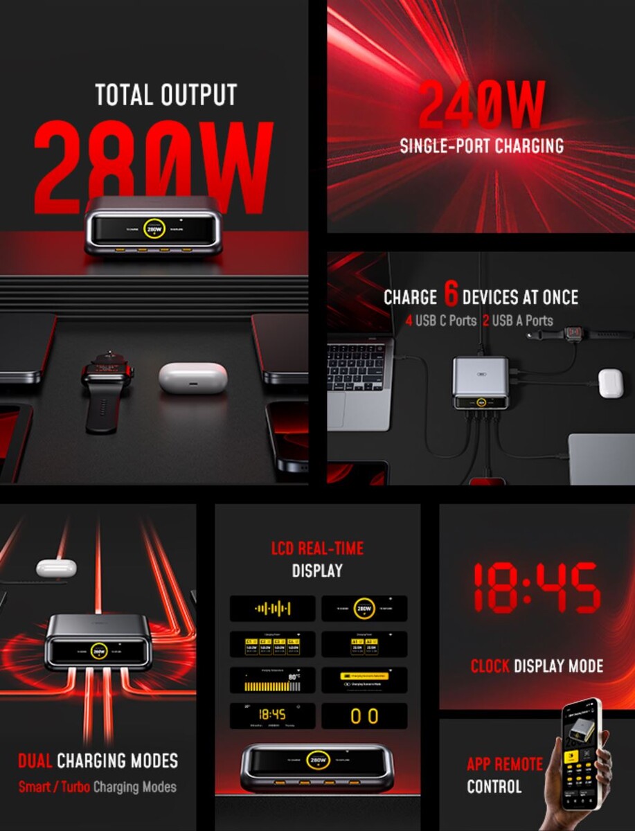 De AOHi 280W GaN+ Desktop Charger is een desktop oplaadstation dat verschillende apparaten van stroom kan voorzien. Visueel lijkt het sterk op bekende alternatieven van Anker en EcoFlow. Met een vermogen tot 280 W zit dit nieuwe model daar precies tussenin. De stroom wordt geleverd via in totaal zes poorten, namelijk vier USB-C en twee USB-A poorten. Er kan tot 240 W worden geleverd via één USB-C poort, waardoor zelfs krachtige apparaten zoals notebooks en dergelijke zeer snel kunnen worden opgeladen.