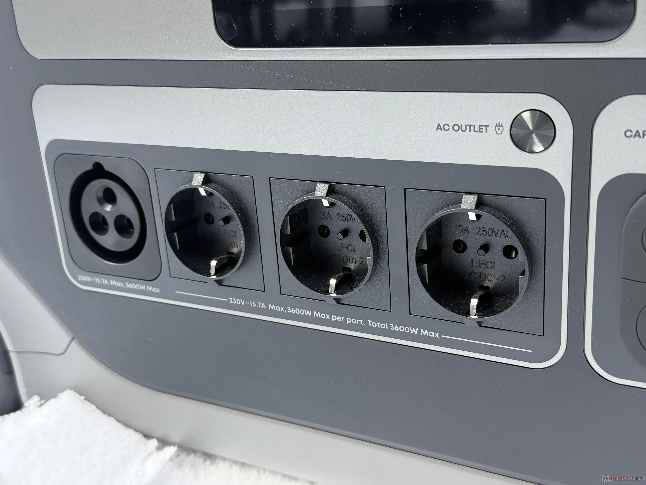 Er zijn niet alleen drie AC-aansluitingen voor de 230V-voeding, maar ook een CEE-aansluiting (bijv. voor walstroomvoorziening voor campers). Er zijn ook twee USB-C (max. 100 W) en twee USB-A (max. 12 W) aansluitingen, naast de gebruikelijke 12 V voertuigaansluiting.
