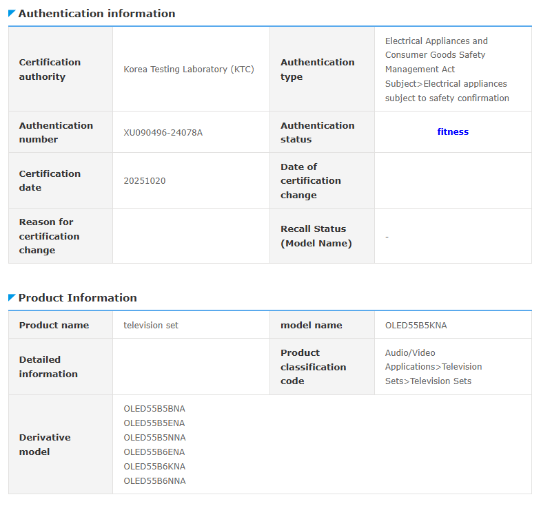 Het zou kunnen dat deze B6 modelnummers betrekking hebben op een aankomende 2026 versie van dit product. Het is de moeite waard om erop te wijzen dat, aangezien ze onder hetzelfde certificaat vermeld staan, de OLED55B5KNA TV waarschijnlijk dezelfde hardware deelt als de OLED55B6ENA, de OLED55B6KNA en de OLED55B6NNA.