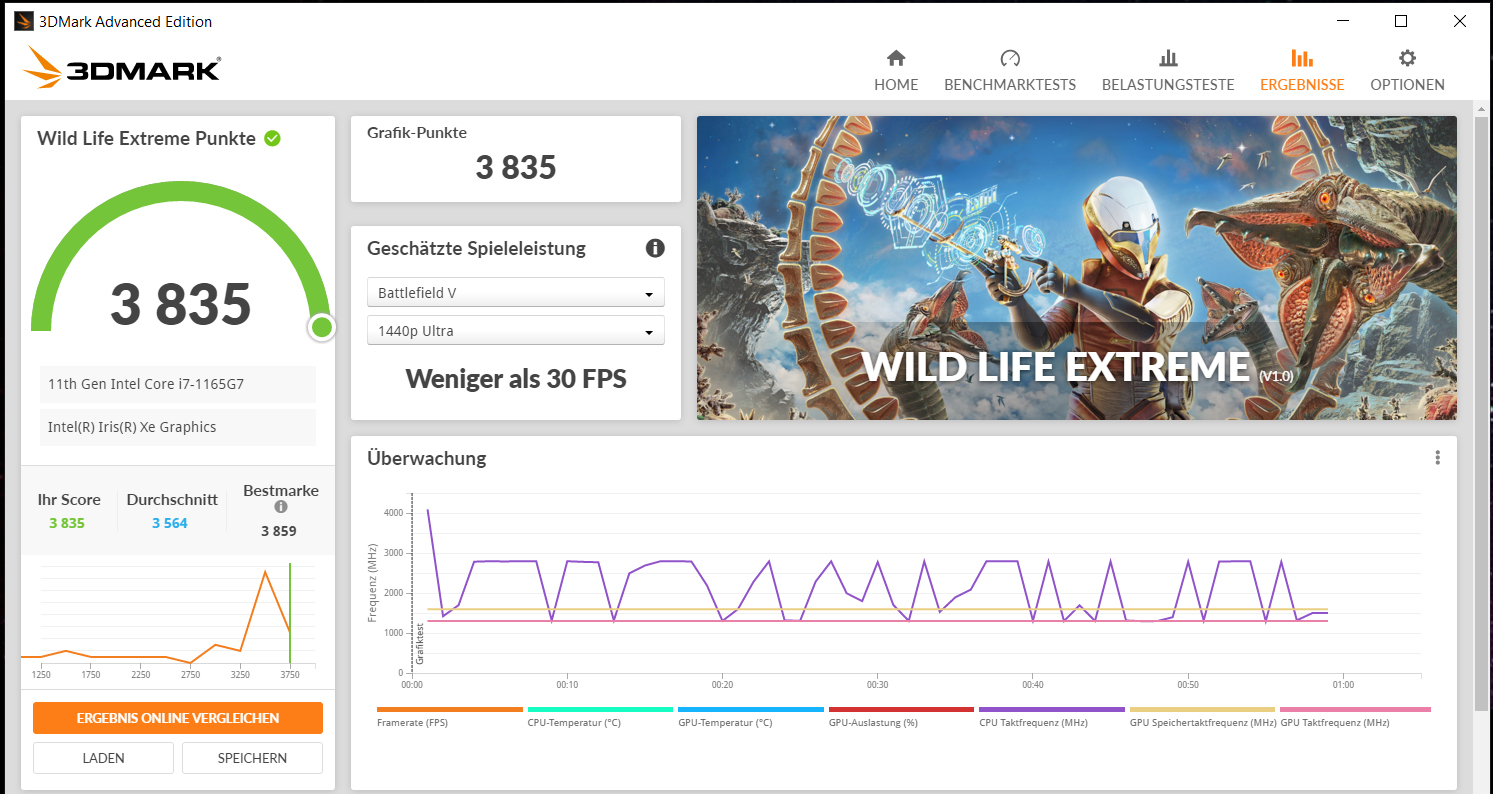 De laptop is niet ontworpen voor langdurige hoge prestaties. De Core i7-1165G7 processor reageert op korte belastingspieken met veel rekenkracht, maar moet gas terugnemen als het gaat om langdurige periodes van belasting. Positief gevolg: De ventilator hoeft niet veel werk te verzetten, en de laptop varieert altijd van stil tot stil