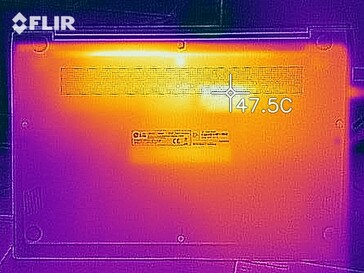 De laptop wordt op geen enkel moment overmatig warm. Tijdens de stresstest worden op drie meetpunten temperaturen in het middengebied van 40 °C (~104 °F) bereikt. De percentages liggen binnen het groene bereik bij dagelijks gebruik
